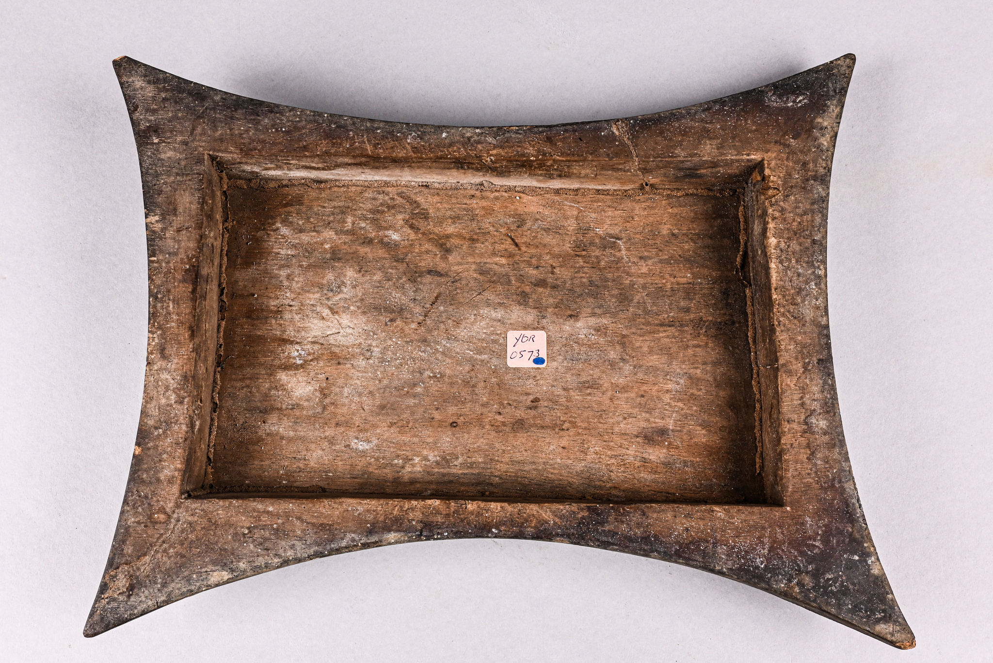 The container shows a special shape with protruding corners and curved sides. Decorations in relief on the lid, including two stylised human figures with artfully intertwined legs (“mudfish legs”).