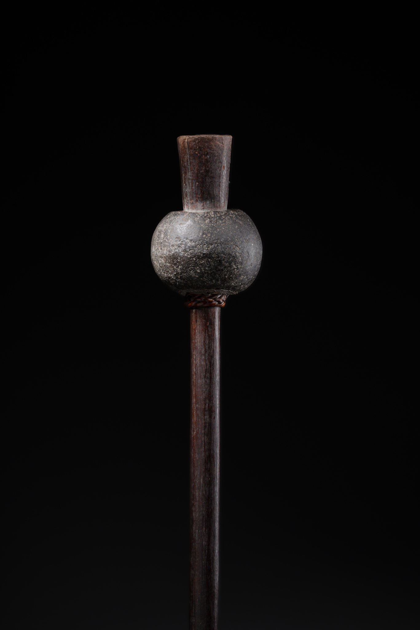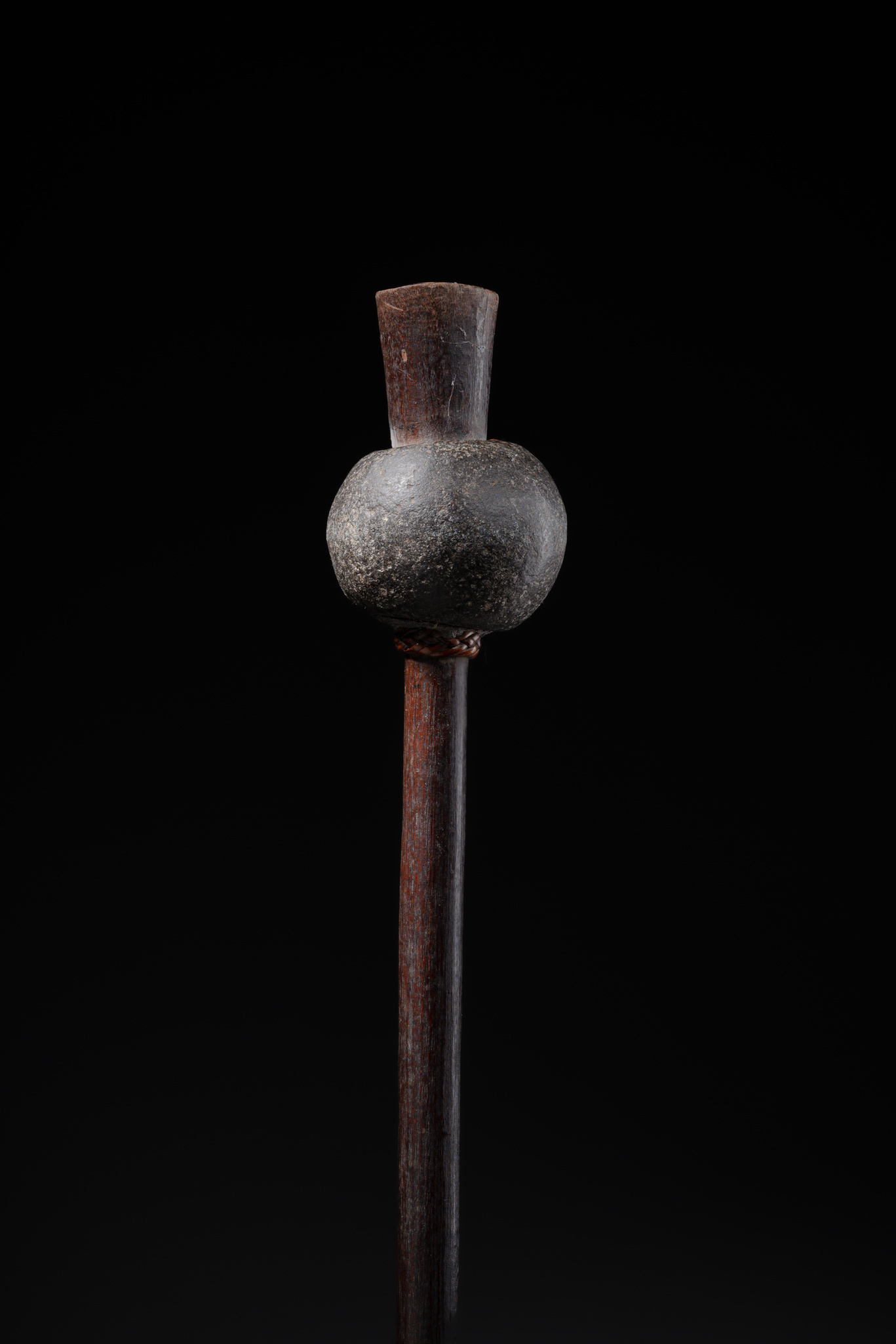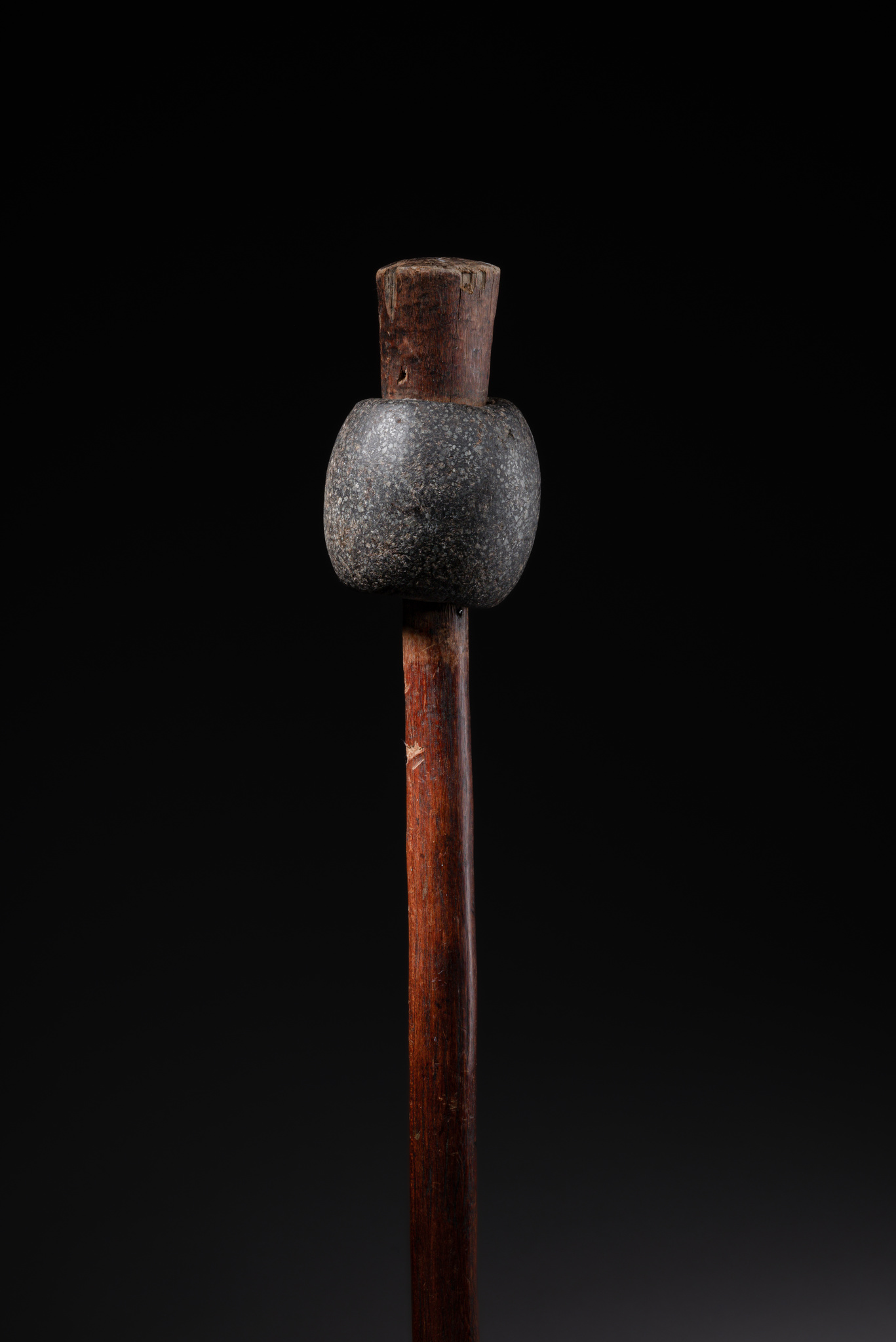 a) club with spherical stone head, parinarium nut paste (with soil and gum from the breadfruit tree), rattan cuff, l: 118 cm (shaft), d: approx. 8.5 cm, h: approx. 7.5 cm (club head)
