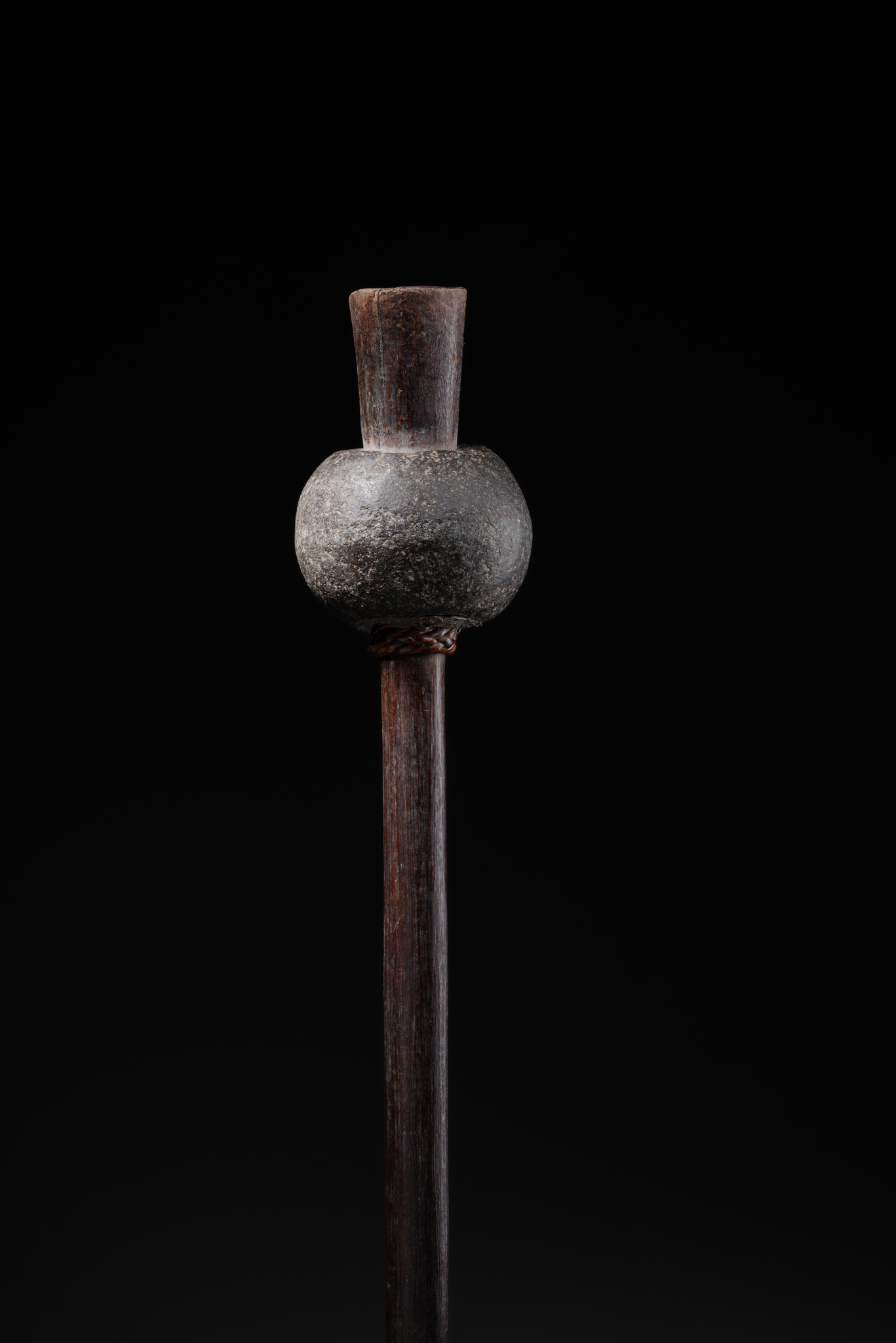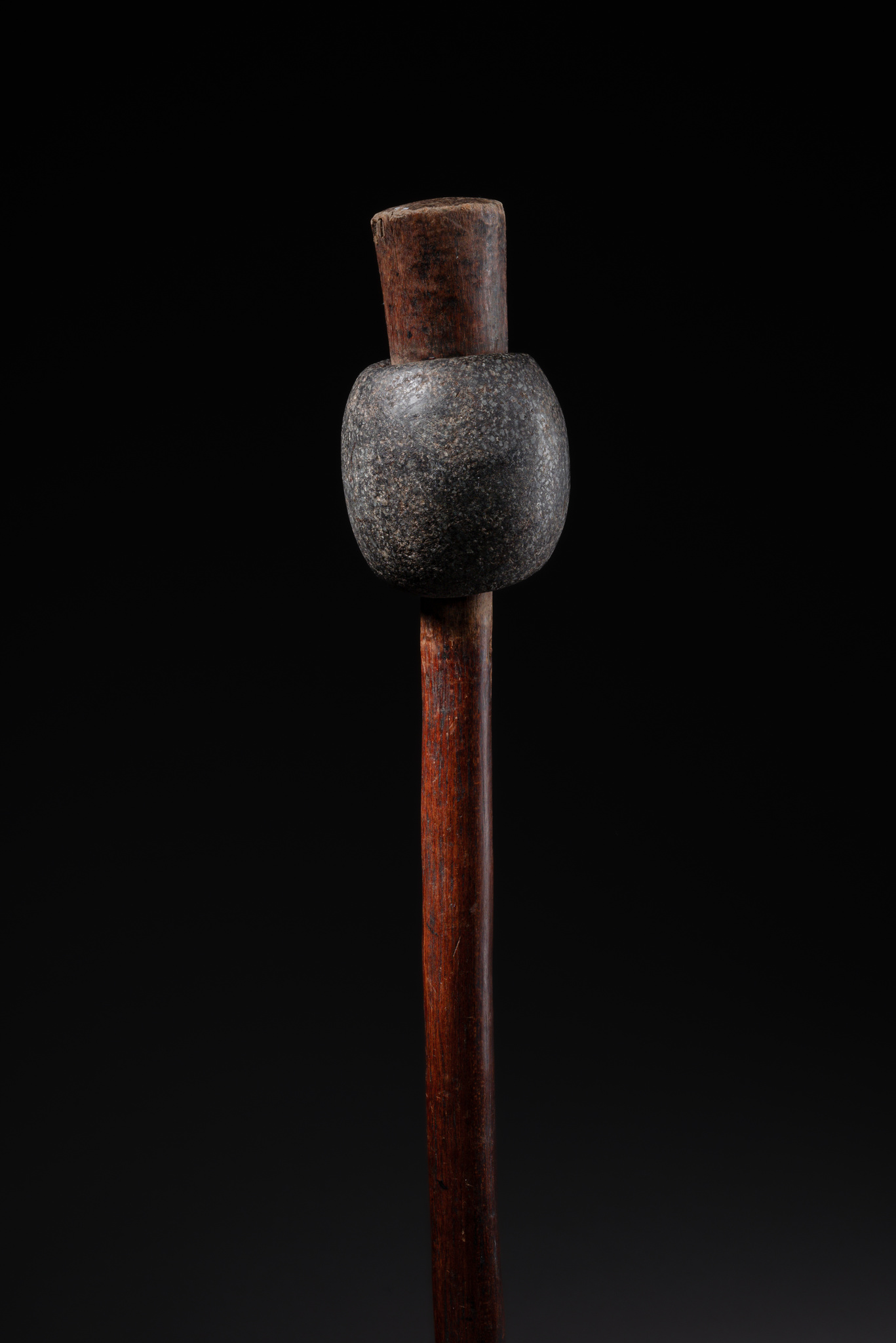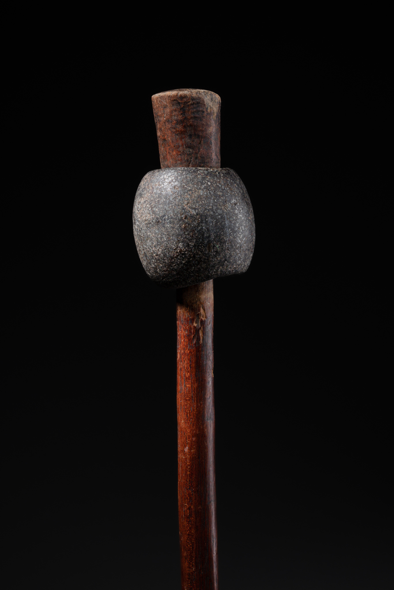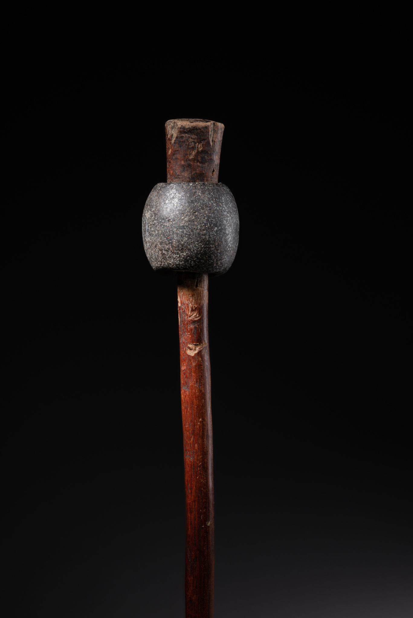 a) club with spherical stone head, parinarium nut paste (with soil and gum from the breadfruit tree), rattan cuff, l: 118 cm (shaft), d: approx. 8.5 cm, h: approx. 7.5 cm (club head)