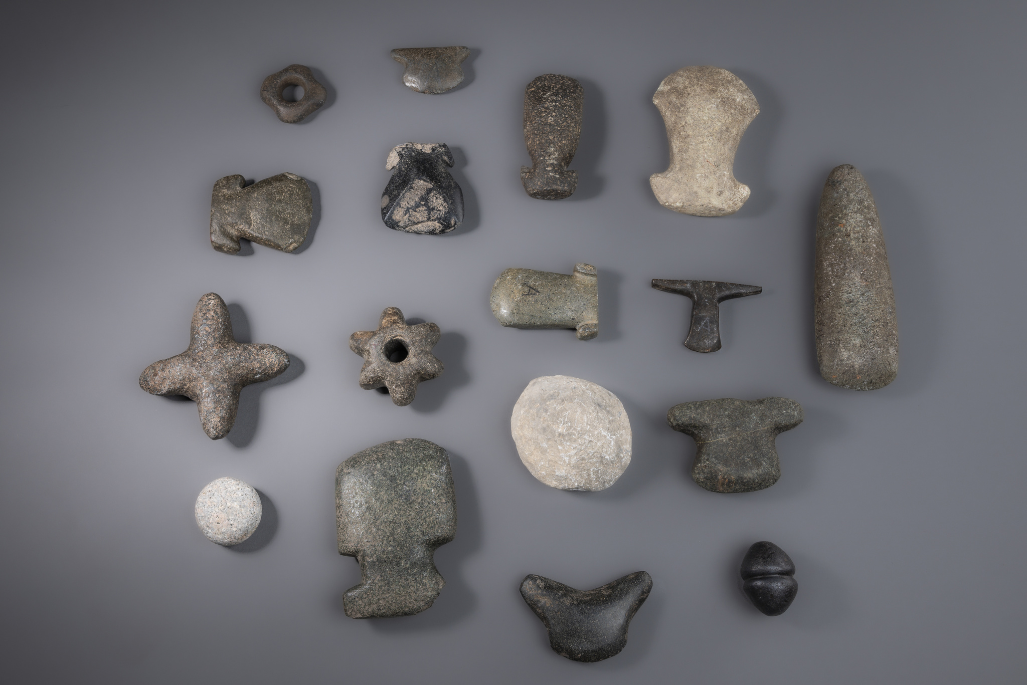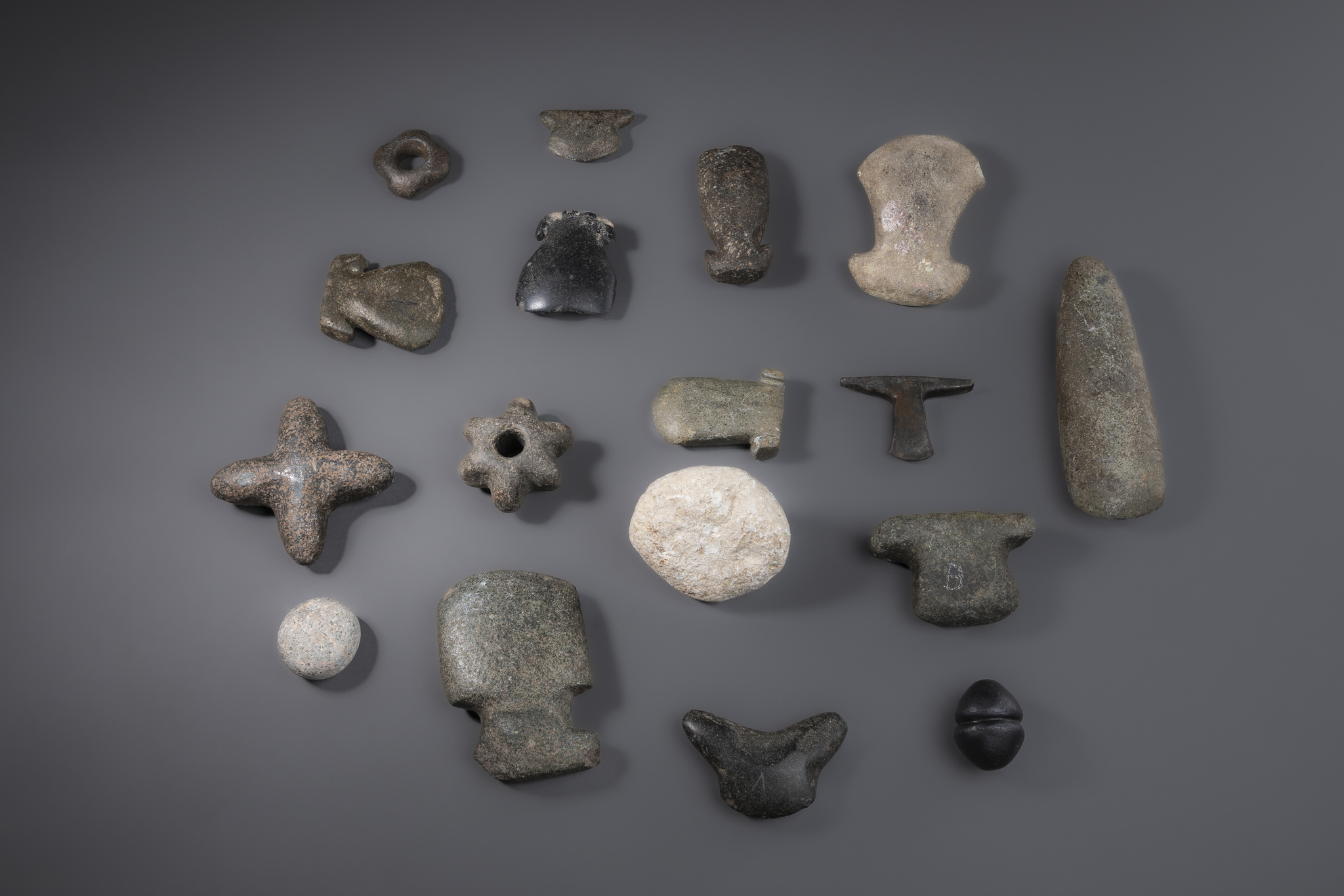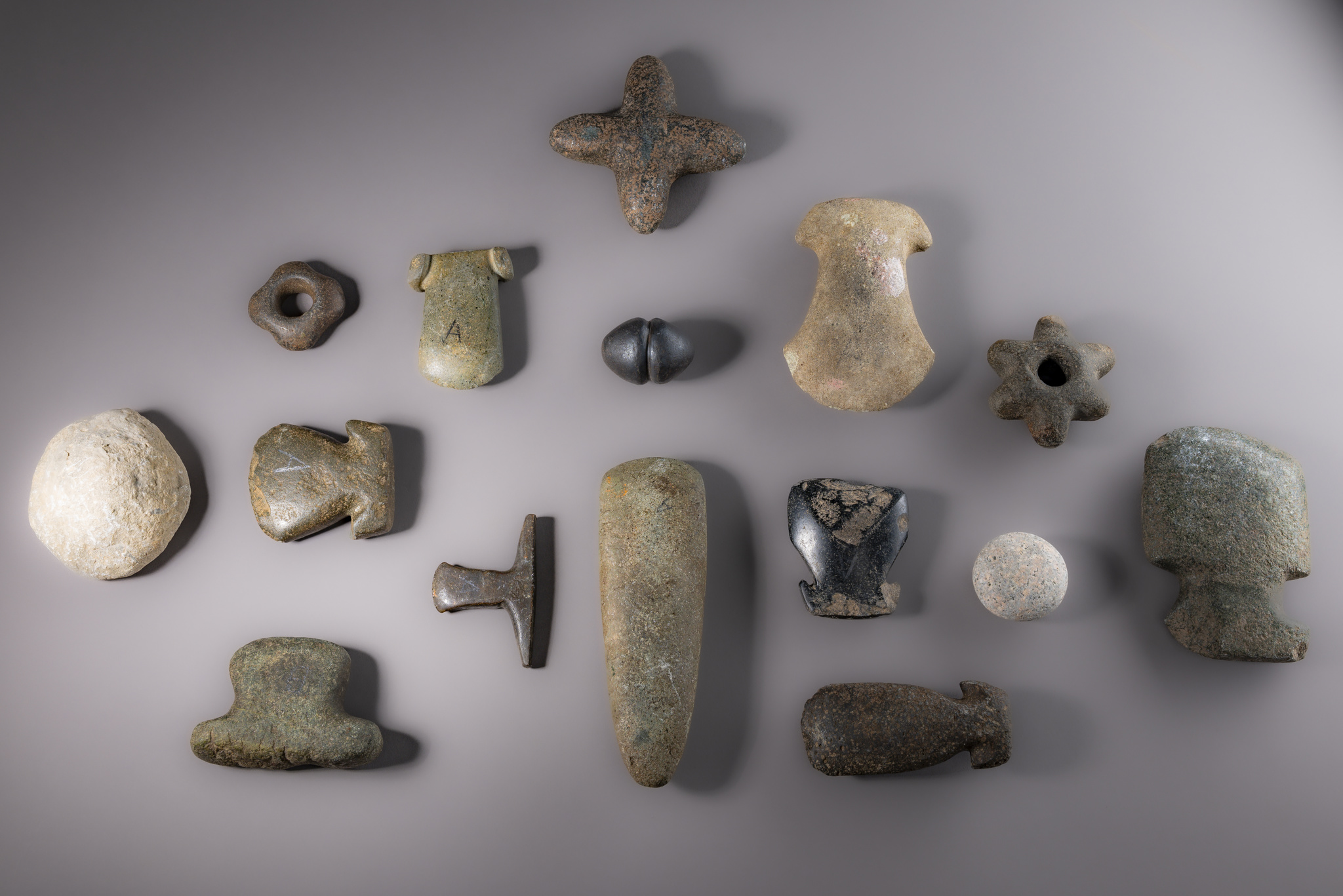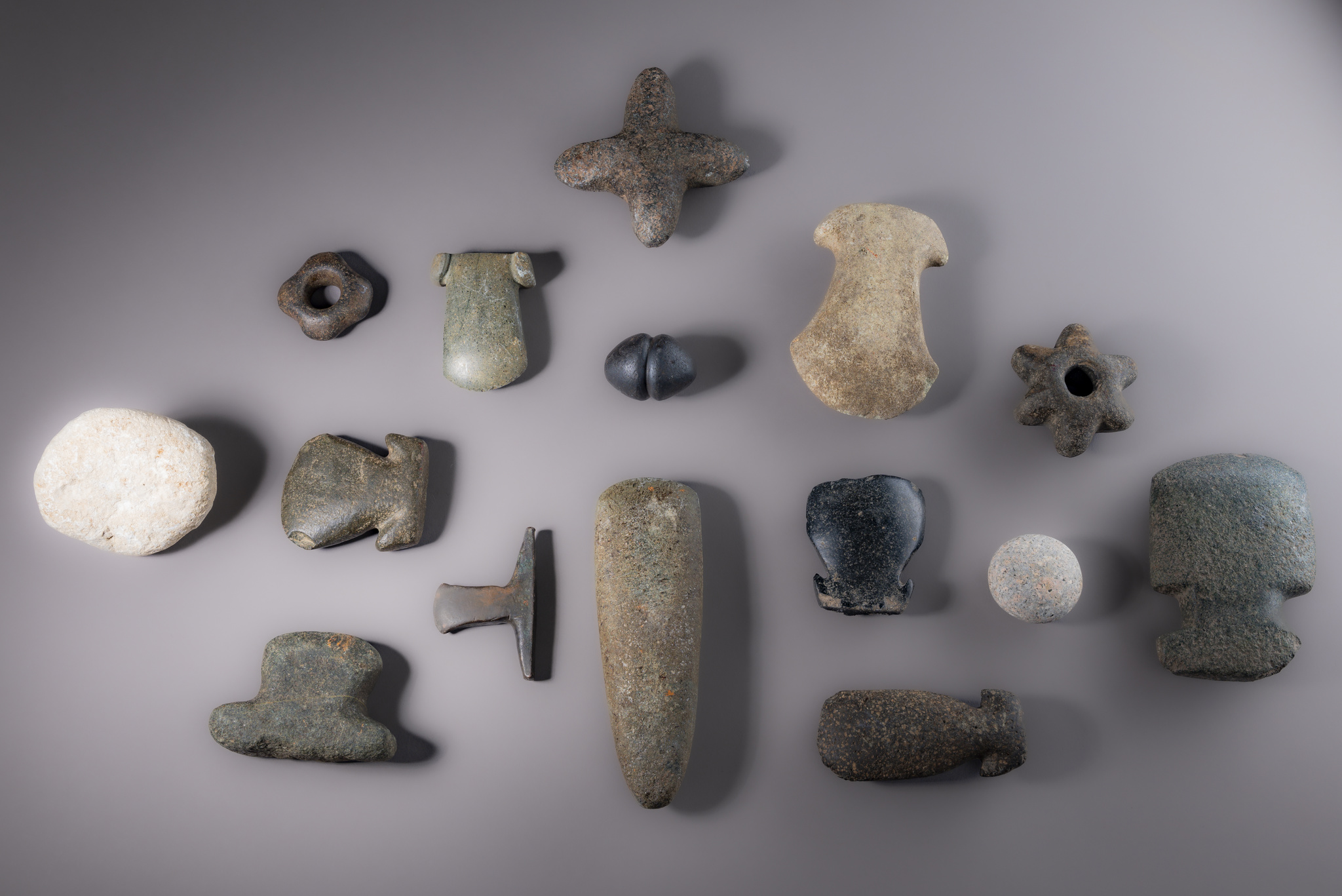 17 pcs., nine axe blades of various materials and sizes, l: 4.5 cm – 15 cm, partly from Ecuador, partly Inca; one cylindrical axe blade, l: 21 cm; three mace heads, d: 6.5 cm – 13 cm; two grinding stones, d: 5.5 cm – 10.5 cm