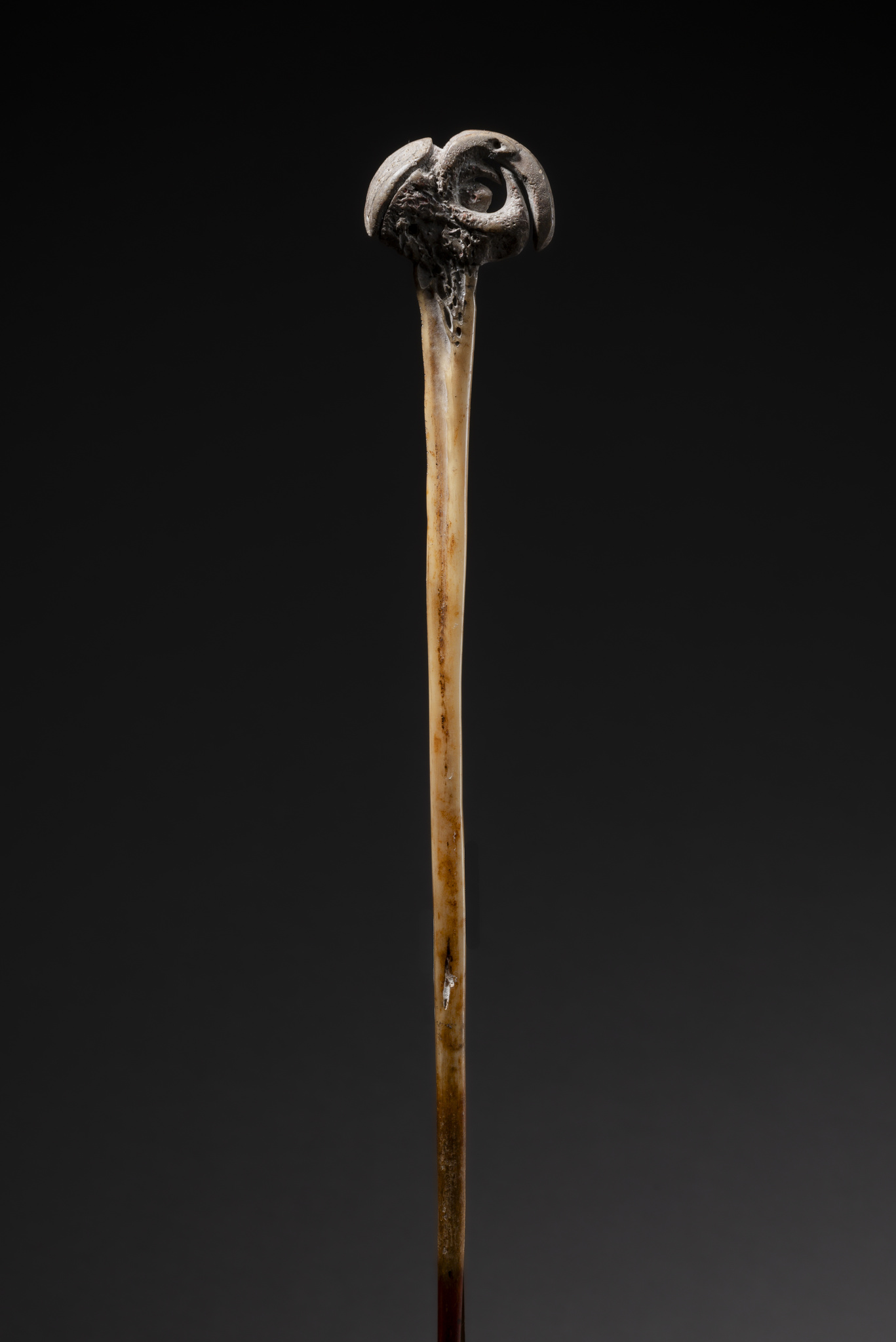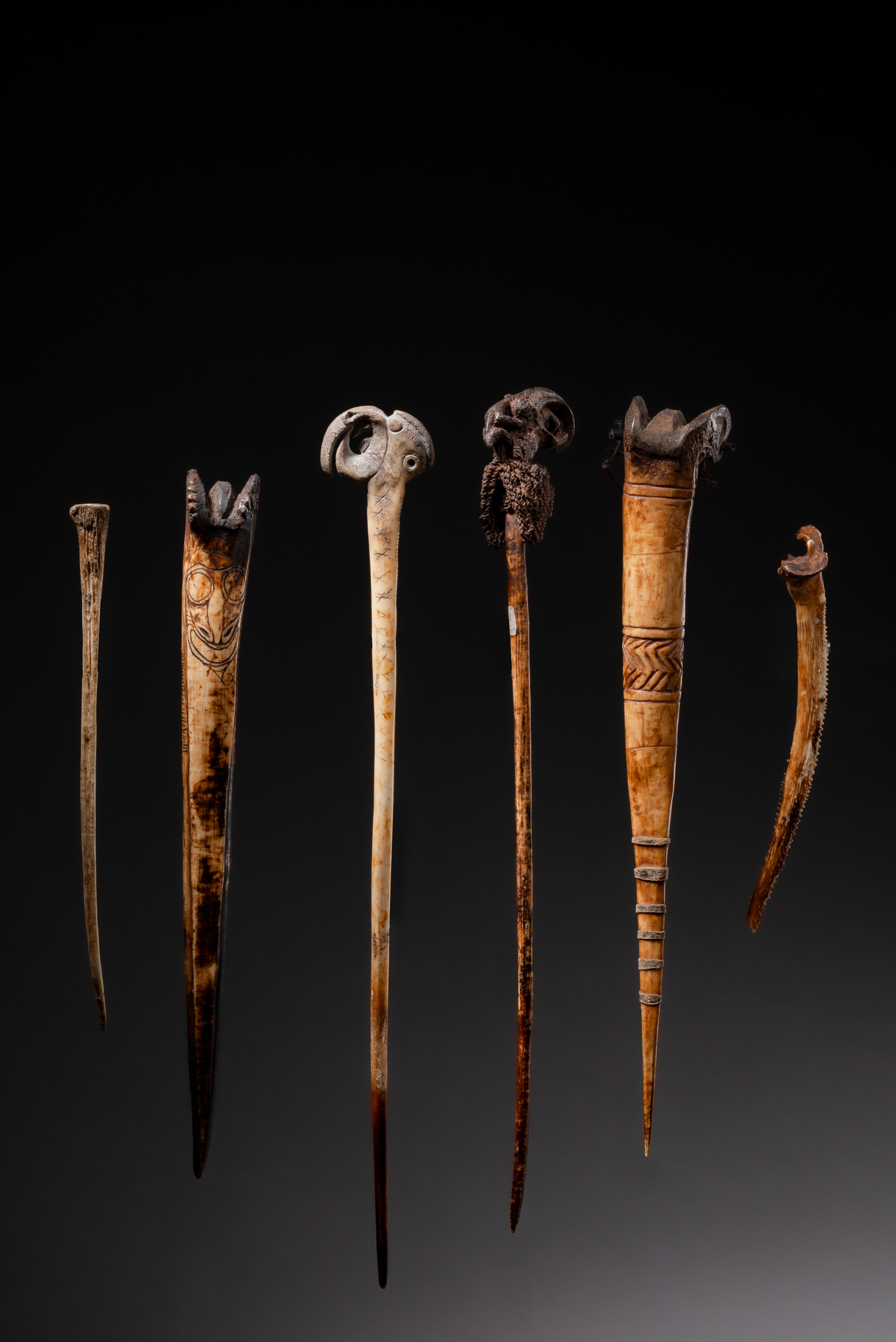 6 pcs., cassowary bone, two lime spatulas “ava toop” with hornbill heads, plant fiber, l: 37.5 cm & 38.5 cm, and a bone dagger, incised with the face of an ancestral spirit, l: 30.5 cm; Sepik bone dagger with fine detail: a toothpick-like bone fragment fixed on the back with a leather strip, l: 33.5 cm.