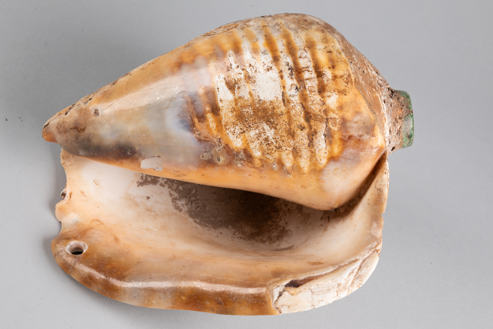 “Tecciztli” shell trumpets are among the oldest instruments in Mesoamerica. Their deep tones were heard at ceremonies, religious festivals, human sacrifices and the mortification of priests. Snails had a high symbolic and material value. Because of their close connection to the basic element of water, they were a symbol of birth and procreation.