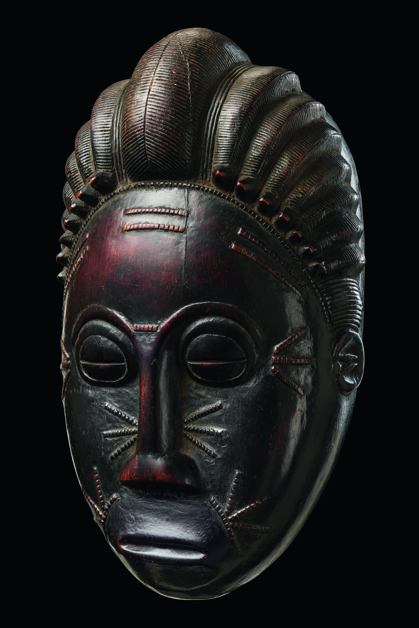 wood, rich blackish brown patina, reddish brown in some areas, flat facial plane, excellente mask with regular facial features creating a calm and internalized expression, ornamental arranged scarification marks, fine carved coiffure, slightly dam., crack (coiffure/forehead), one drilled hole on the back broken out, abrasion of paint;