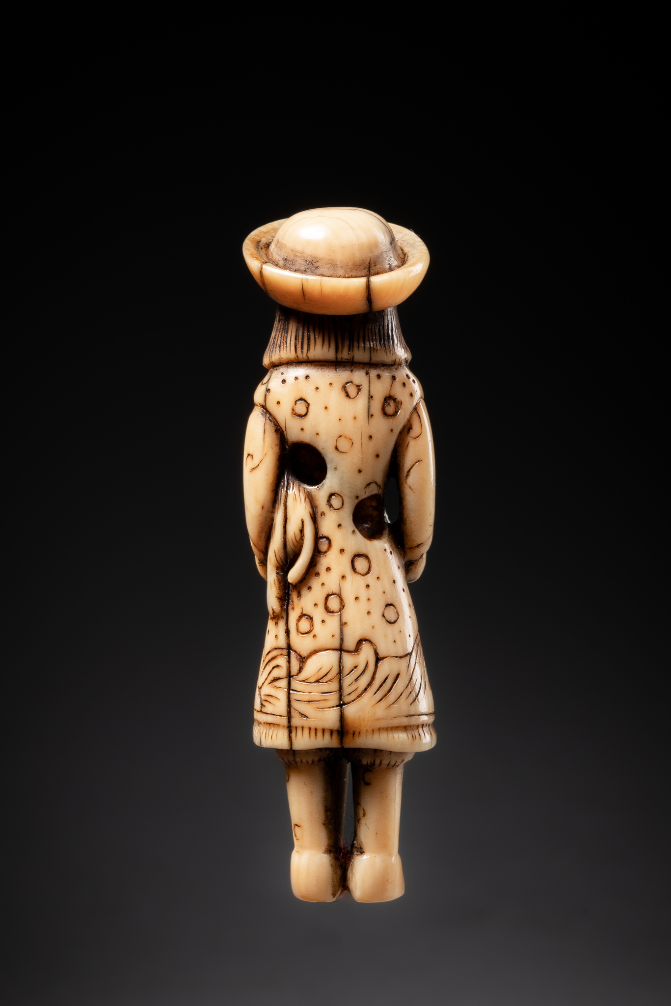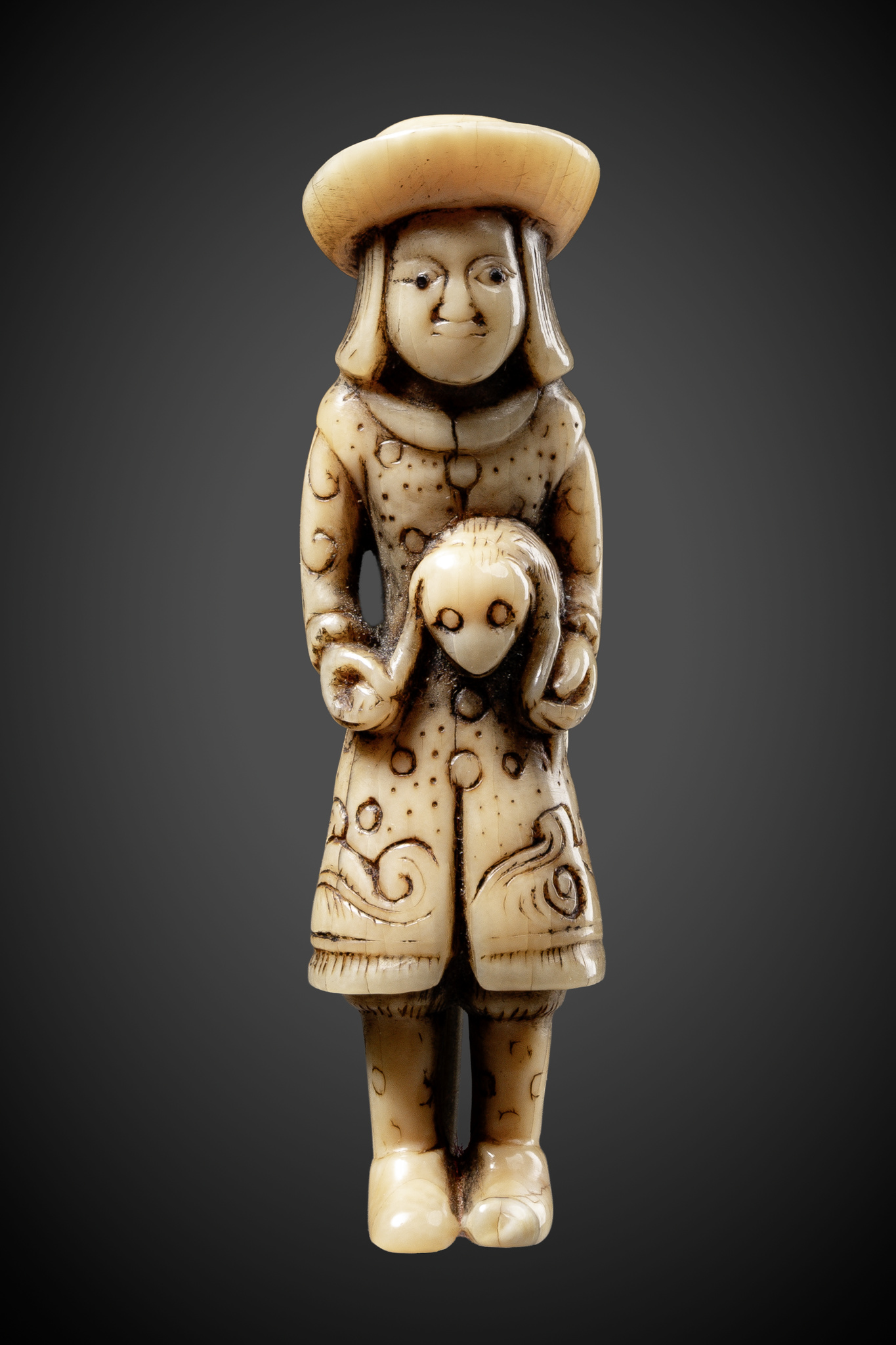 The small netsuke figure depicts a European (Dutchman) holding a small monkey under his arms and grasping it by its paws. The depiction of foreigners with exotic animals - especially monkeys - was a widespread and popular netsuke motif from the Edo period onward, reflecting both a fascination with the foreign and a humorous observation of cultural difference.
