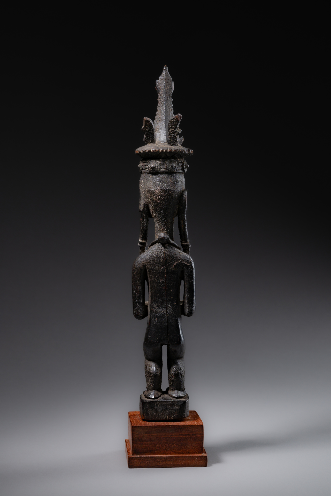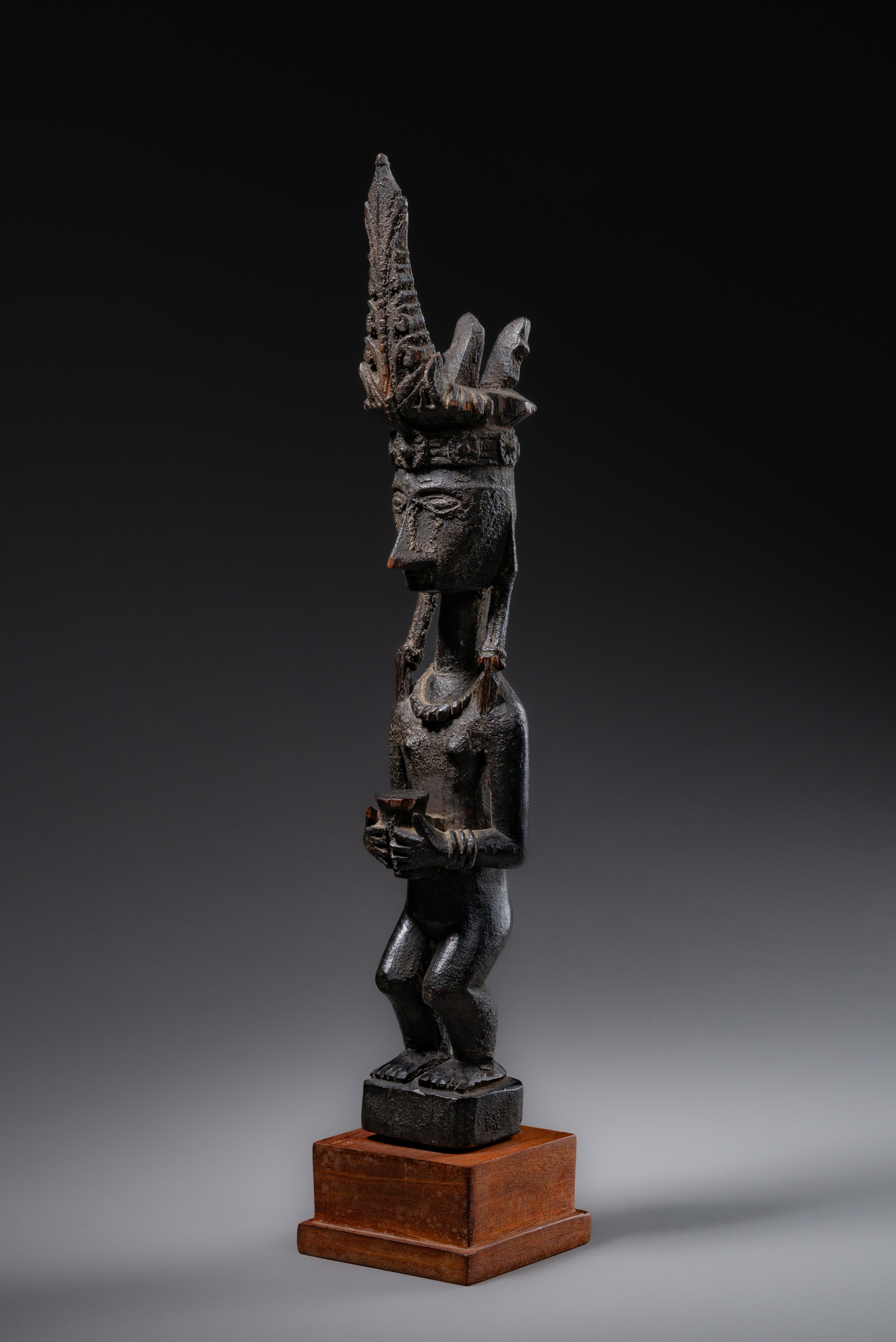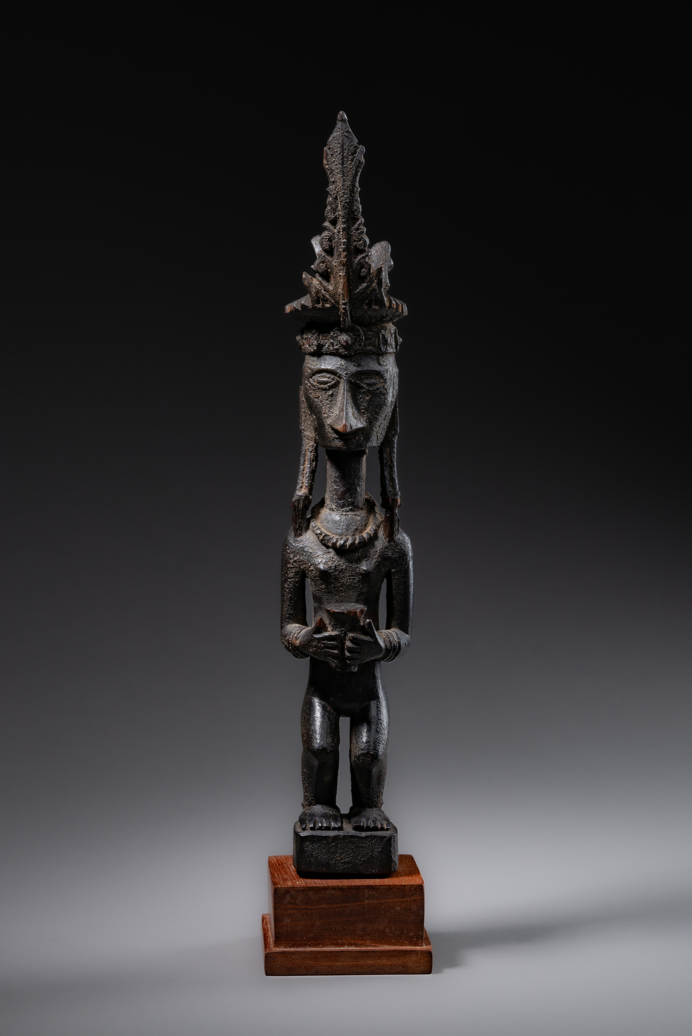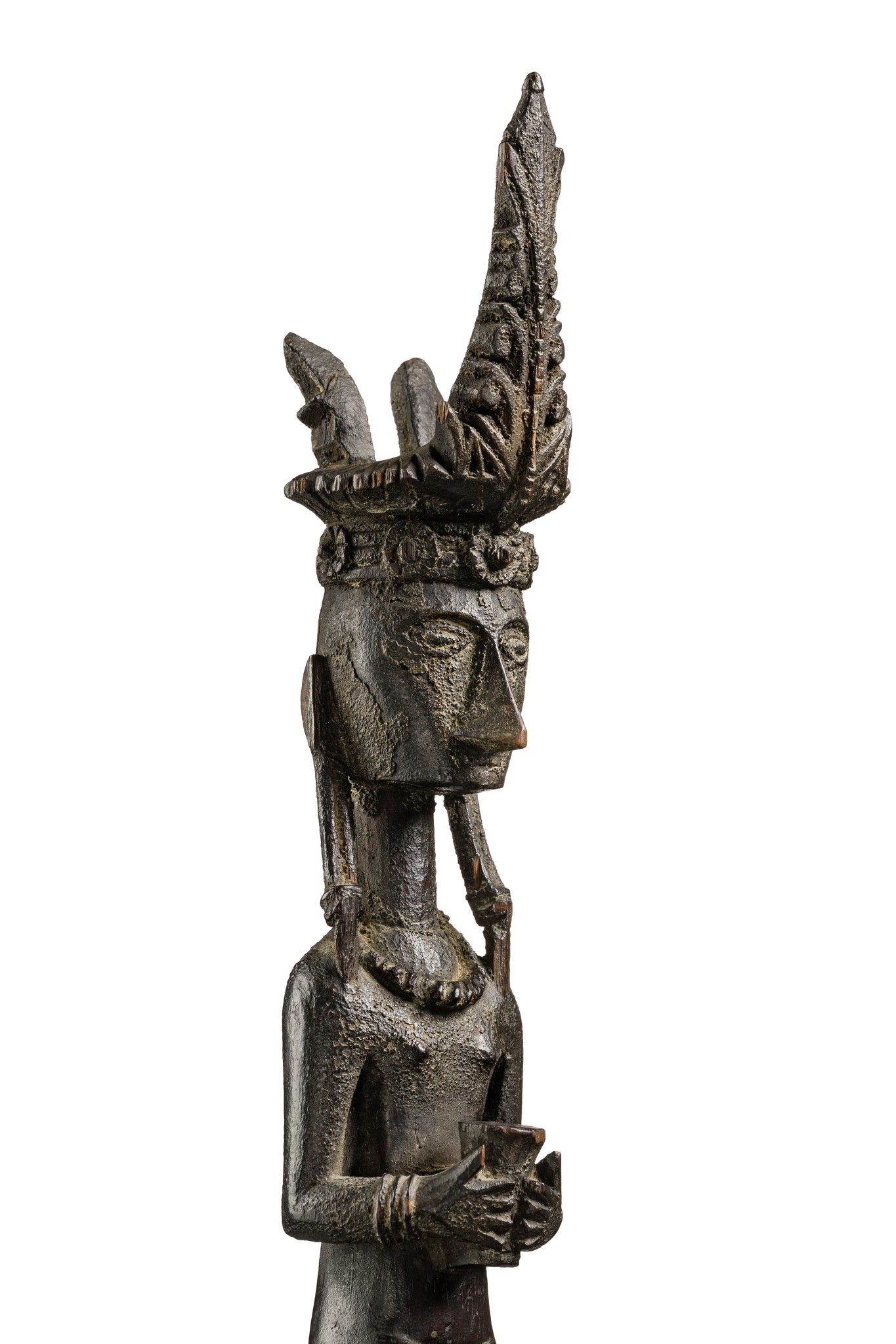 An unusually finely and elaborately crafted and especially richly decorated figurine. She wears a headdress consisting of a forehead band adorned all around with rosettes and a tall palm leave crown. A beautiful detail is the intricately worked toggle-like clasp of her “nifatali” necklace at the back of her neck. Both ears are adorned with long earrings, and both wrists are carved with bracelets.