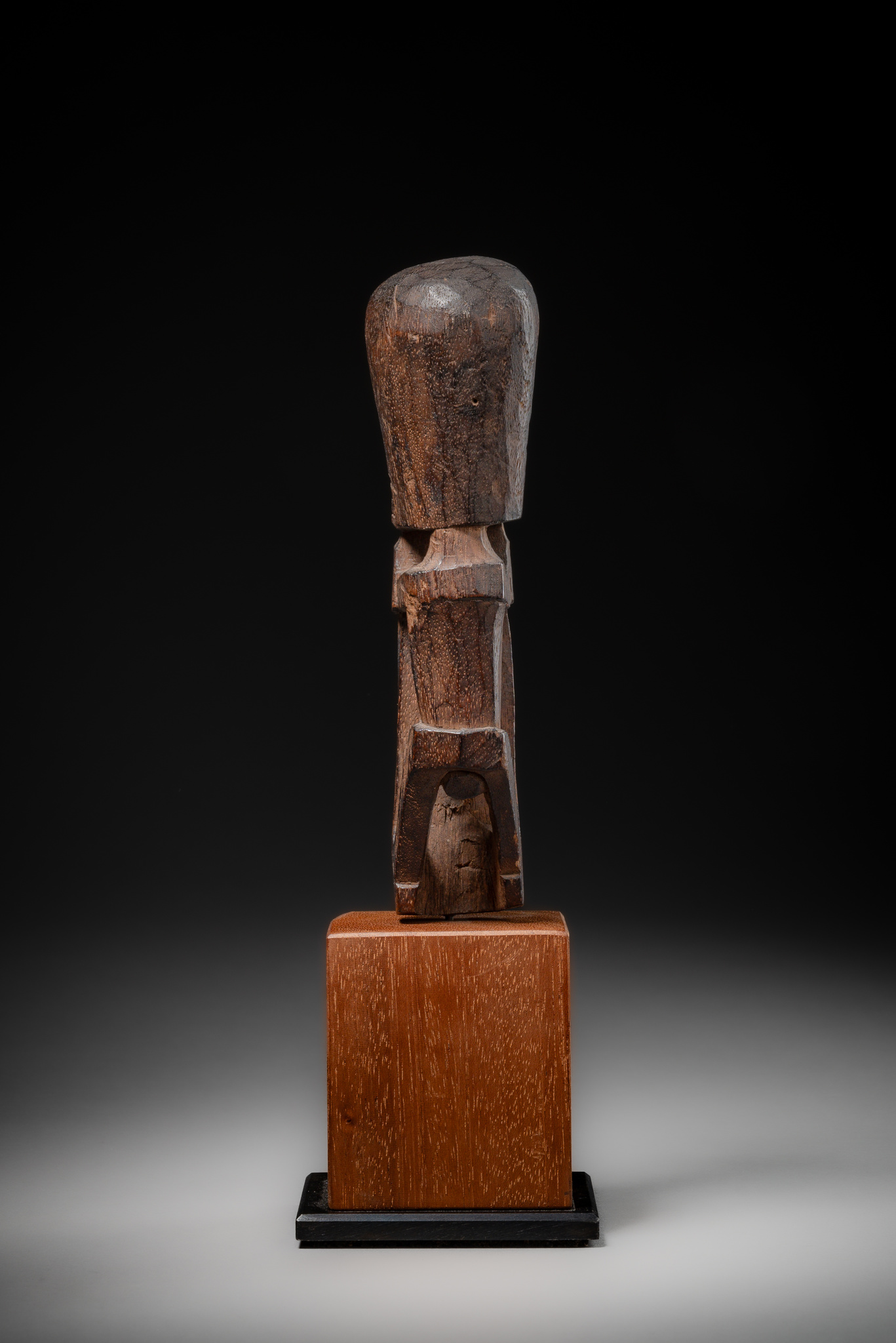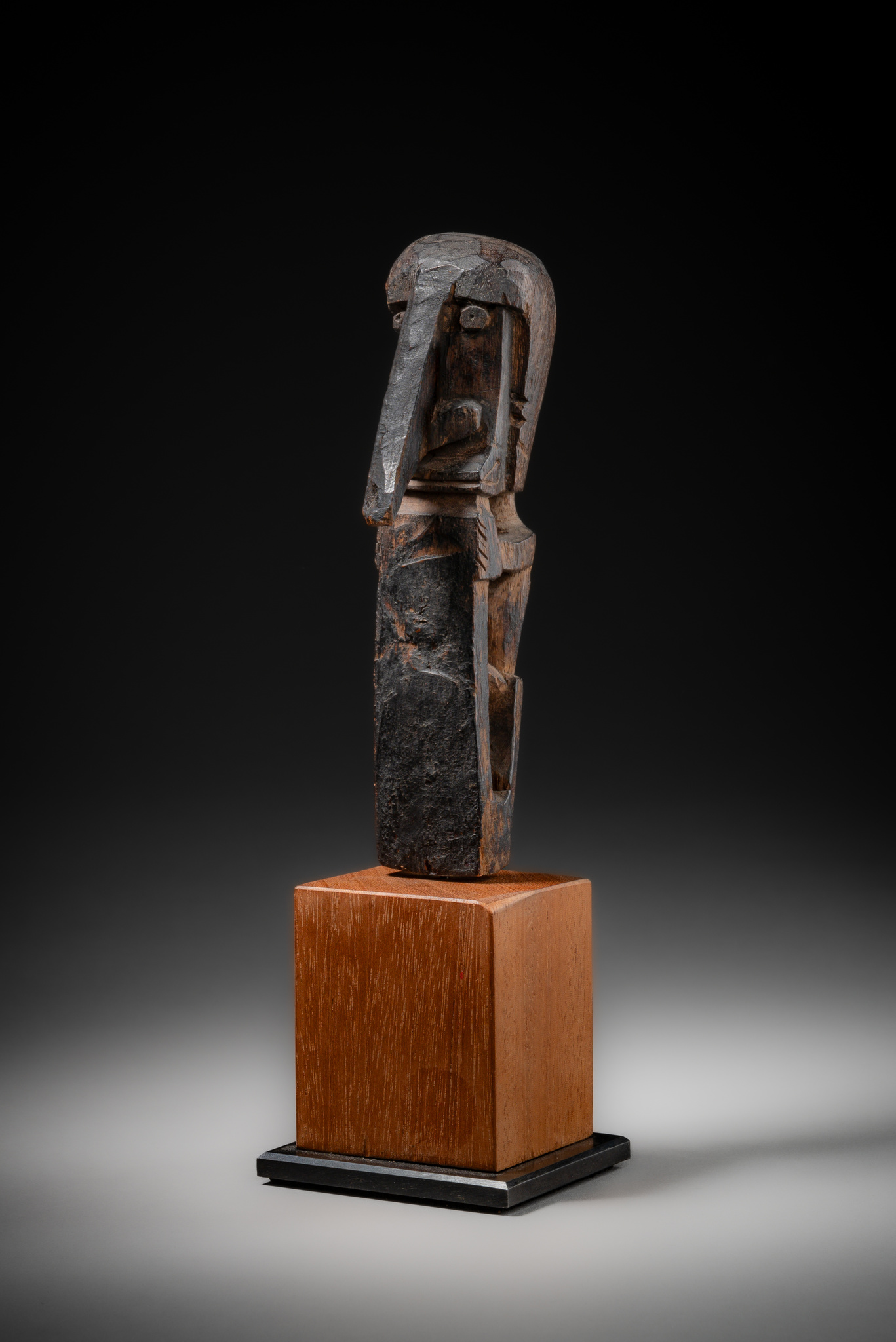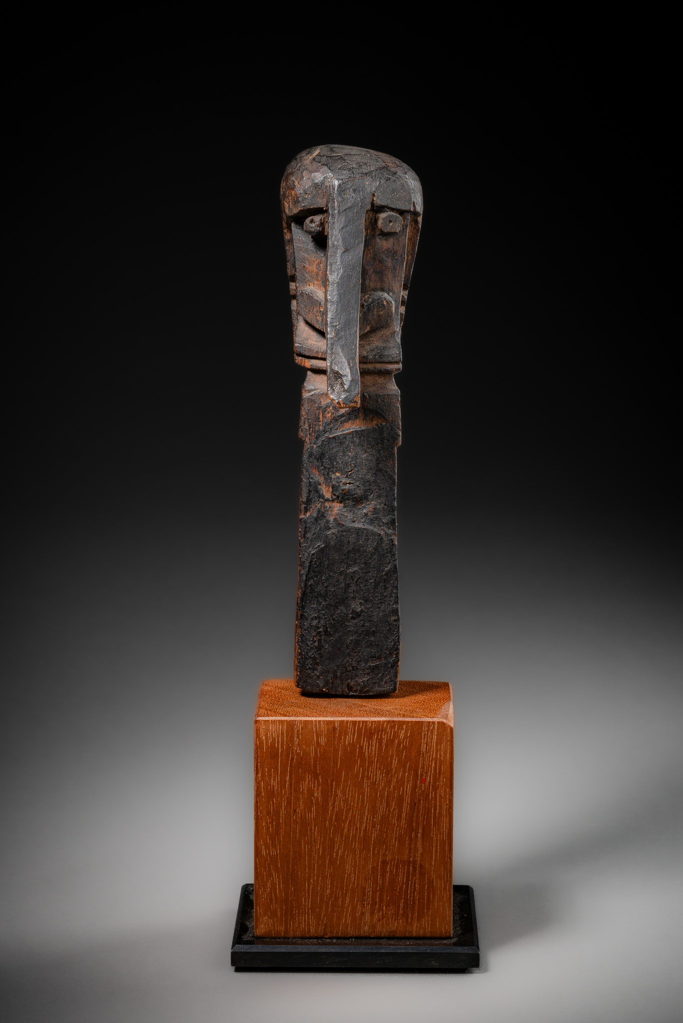 The depiction of the “korwar” was highly conventional. The prominent head and arrow-shaped nose, exaggerated in a stylized manner in this example, are considered defining features of the style. The genitals of this “korwar” are particularly emphasized. Concepts relating to fertility and spiritual power were closely associated with sexuality and procreation.