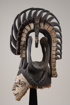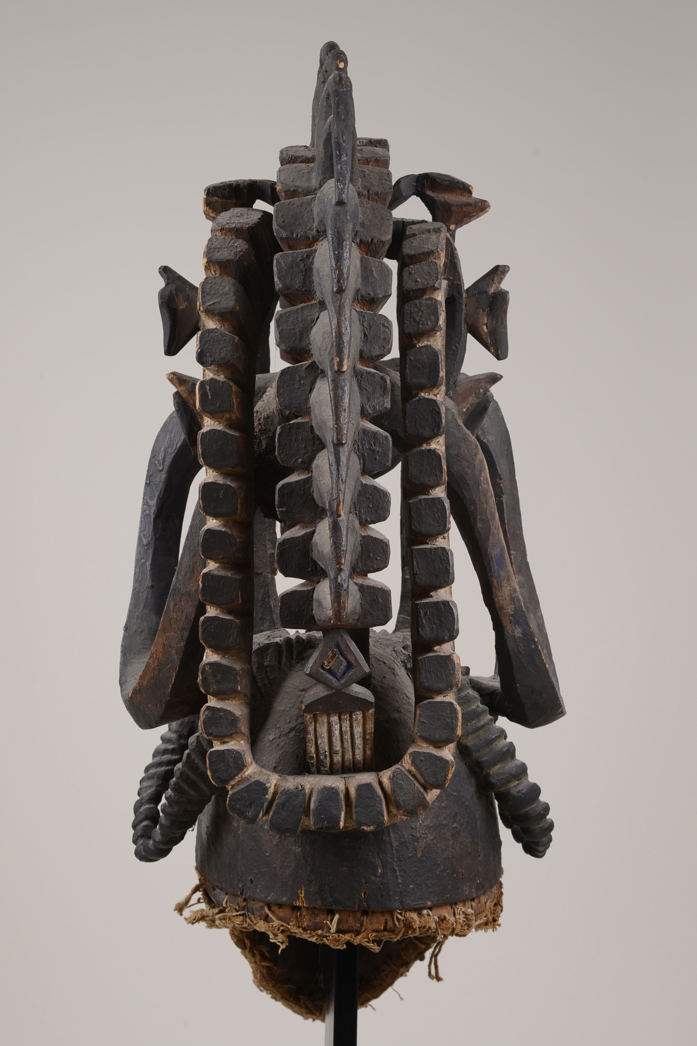wood, matt patina, polychrome paint, sharp cut facial features with thin lips, visible teeth and accentuated scarification marks, crowned by a high-towering openworked coiffure with projecting lobes on both sides, remains of a costume, rep. (breakages coiffure), cracks, small missing parts, slight traces of abrasion, base;
