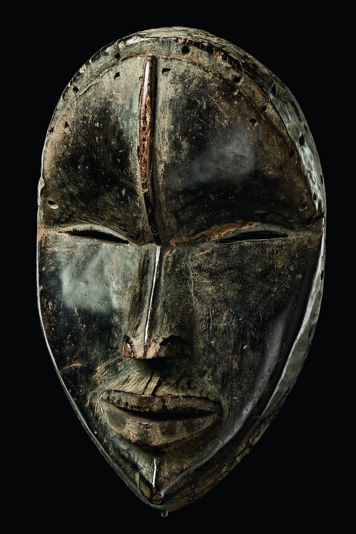 wood, partly shiny, partly encrusted dark brown patina, a concave facial plane, the bulging forehead separated from the facial plane by a horizontal deepened line, forehead and nose accentuated by a vertical ridge, pierced around the rim, min. dam., missing parts through insect caused damage on the rear, cracks, slight traces of abrasion, base;