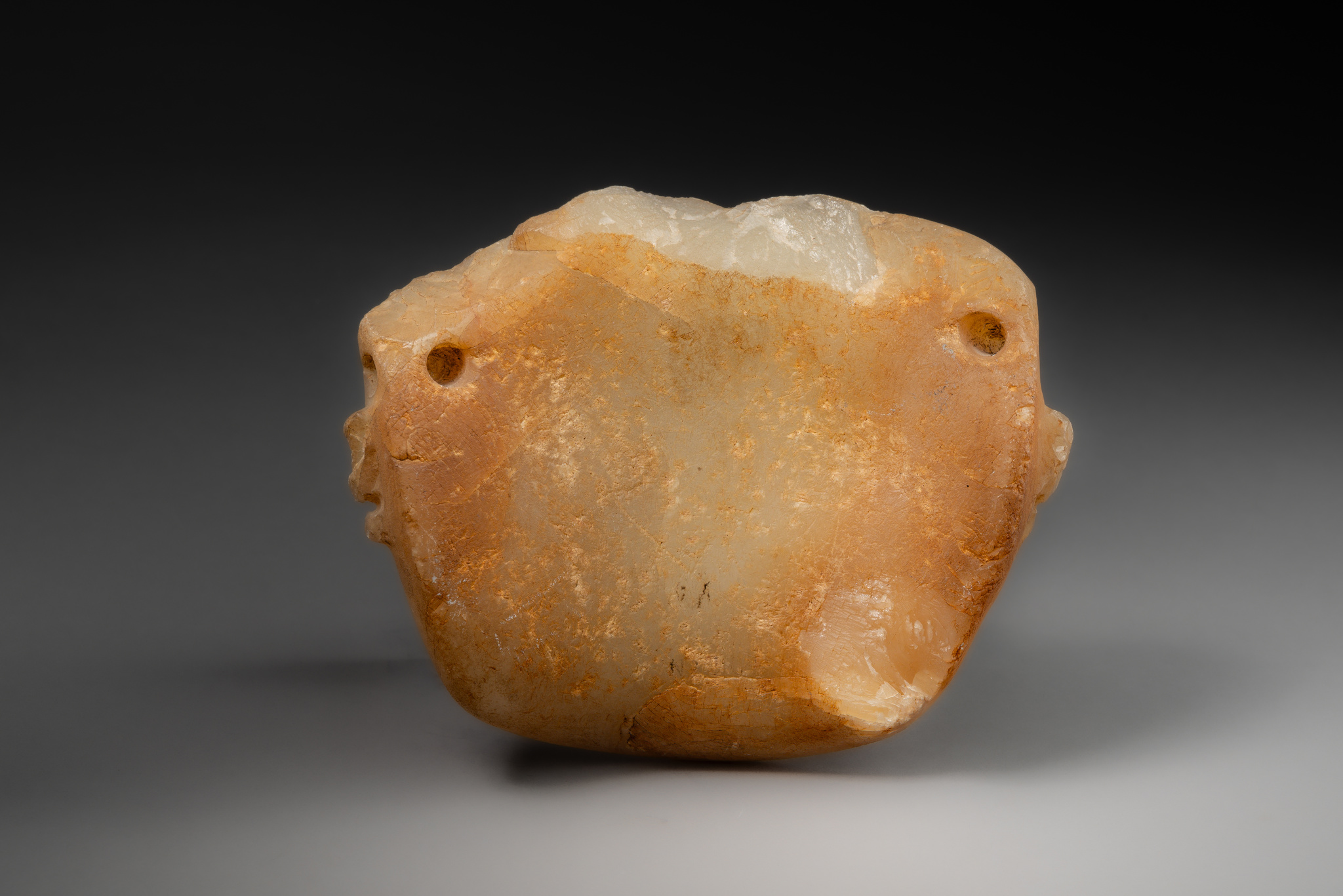 This mask, with its calm, balanced expression, embodies the idealised aesthetics of the classical period of Teotihuacan. It features clearly defined lips, inlaid indentations at the corners of the mouth and eyes, a strikingly shaped aquiline nose, and finely arched, narrow eyebrows