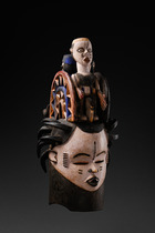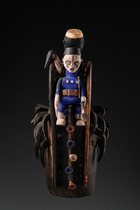 Elaborately worked helmet mask, crowned by two disc-shaped openwork elements, a bird and two anthropomorphic figures in the shape of a man with a walking stick and a soldier. Many separately worked elements fixed with nails complement the object: the pipe in the soldier’s hand, the horn-shaped extensions of the hairstyle, and the funnel-shaped decorative elements on the back.