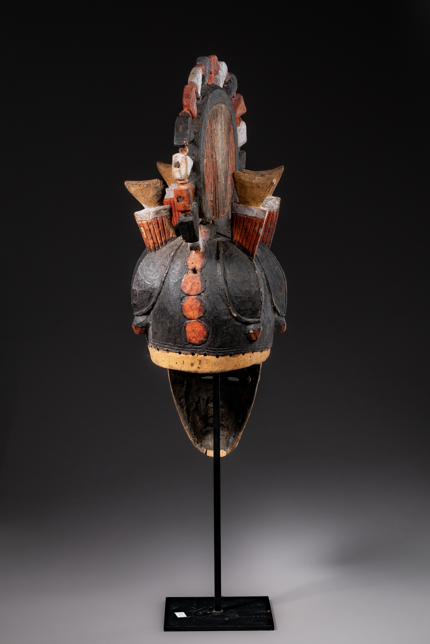 This mask type symbolizes the ideals of youthful female beauty. It belongs to the “mmwo” men’s society and is performed exclusively by men. It is worn during harvest festivals (the “yam cult”), the annual ceremonies in honor of the earth spirit “Ane”, and at elaborate funerals of society members. The mask is complemented by a colorful, tight-fitting costume with false breasts.