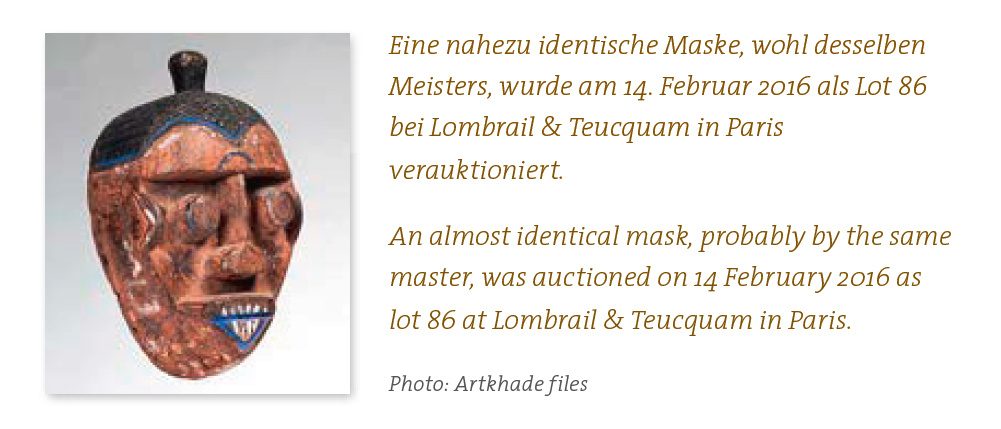 An almost identical mask, probably by the same master, was auctioned on 14 February 2016 as lot 86 at Lombrail & Teucquam in Paris.