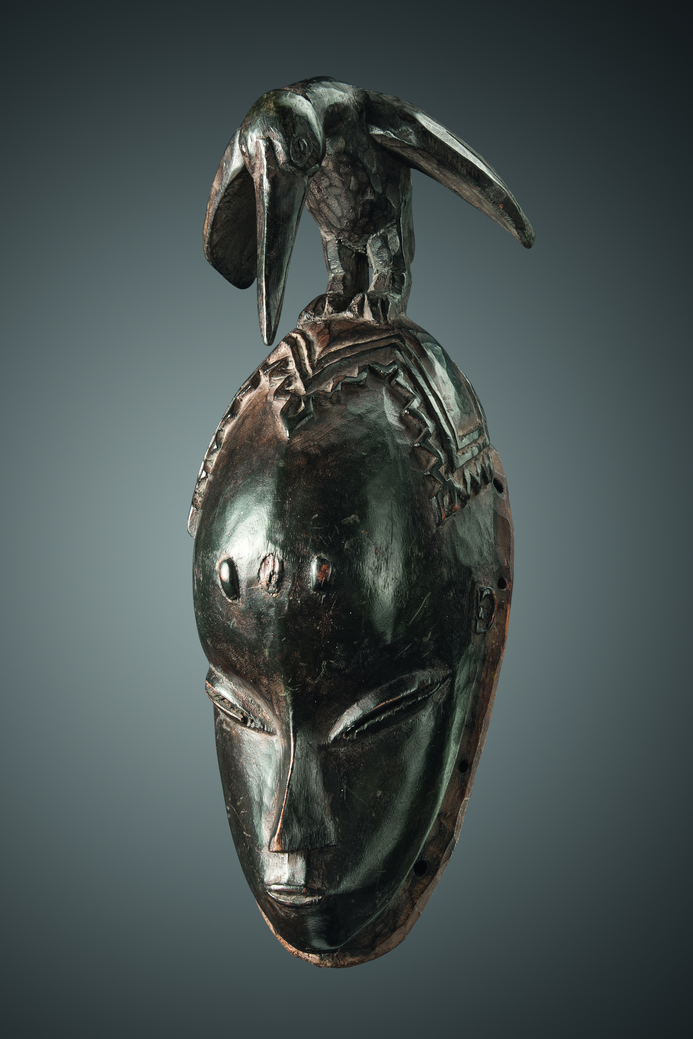 wood, rich blackish brown shiny patina, of narrow elongated form, crowned by large bird sculpture, special features: slanted position of the eyes and beautiful curved profile, nose with sharp-edged bridge extremely narrow and without nostrils, hairline in three jags, slightly dam., minor missing parts (nose tip, forehead tattoo, rims of the lids);