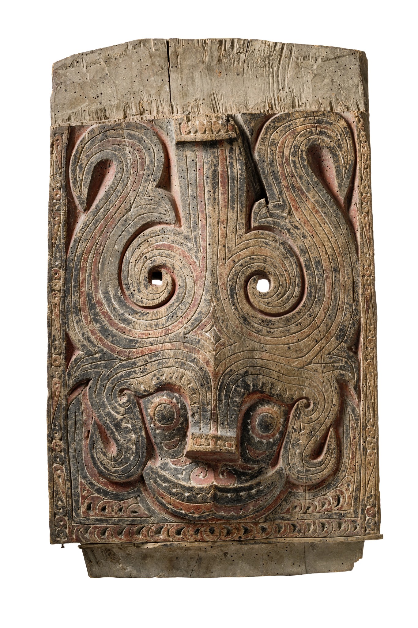 wood, traditional pigments in red, black and white, with stylized “singa” mask in the centre