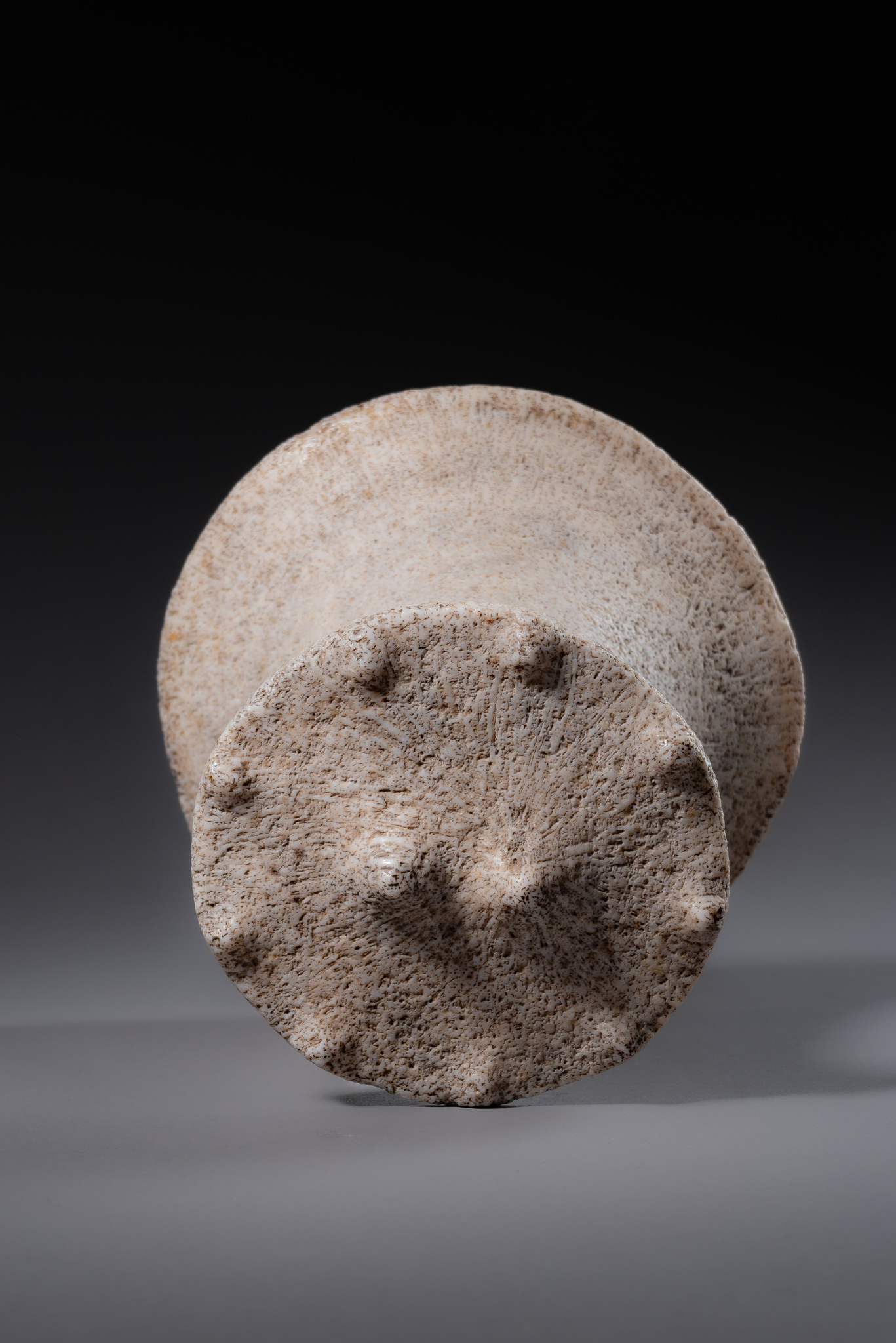 The form of this food pounder is characteristic of examples produced on the Truk (Chuuk) Islands. Unusual, however, is the design of the flat top: instead of the usually common four nipples, this object features eleven evenly distributed protrusions.