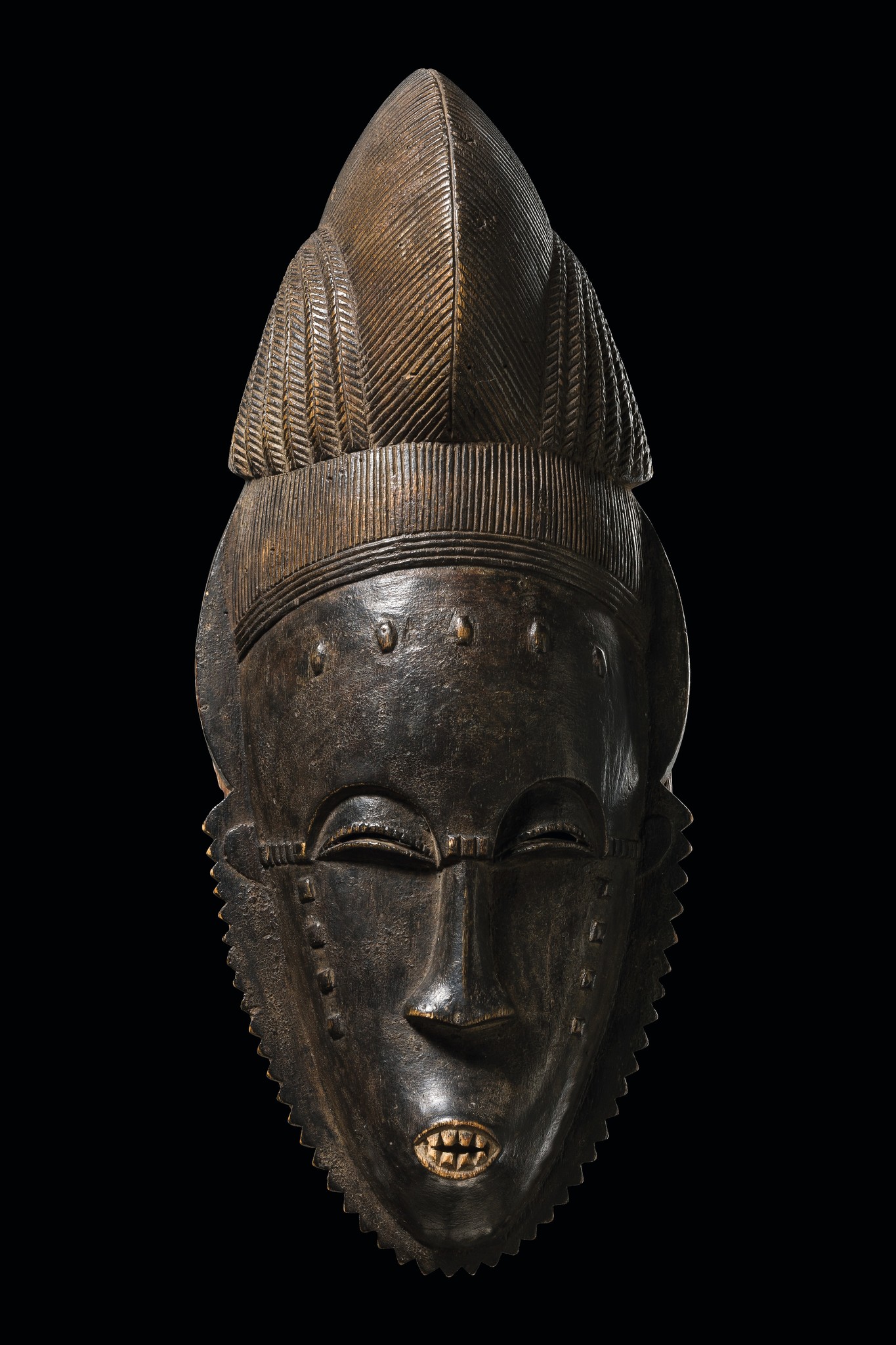 wood, encrusted blackish brown patina, traces of white pigment, narrow elongated face with elaborate high towering coiffure, accurately cut regular facial features: beautifully curved eyebrows, sickle-shaped pierced eyes, delicate nose, small oval mouth with tiny teeth, scarification marks “ngole” at the corners of the eyes, projecting flat rim framing the whole face, within the lower half fomed as jagged beard, slightly dam. (nose, mouth, jags), minor missing parts backside along rim;
