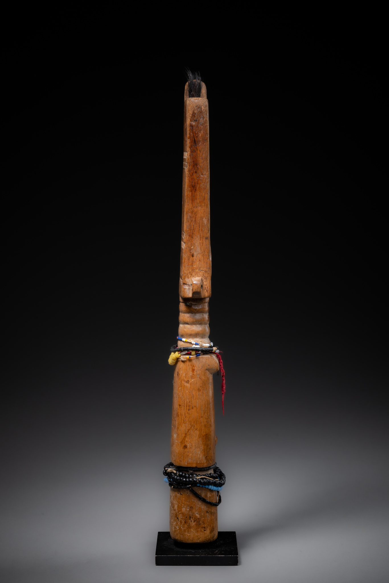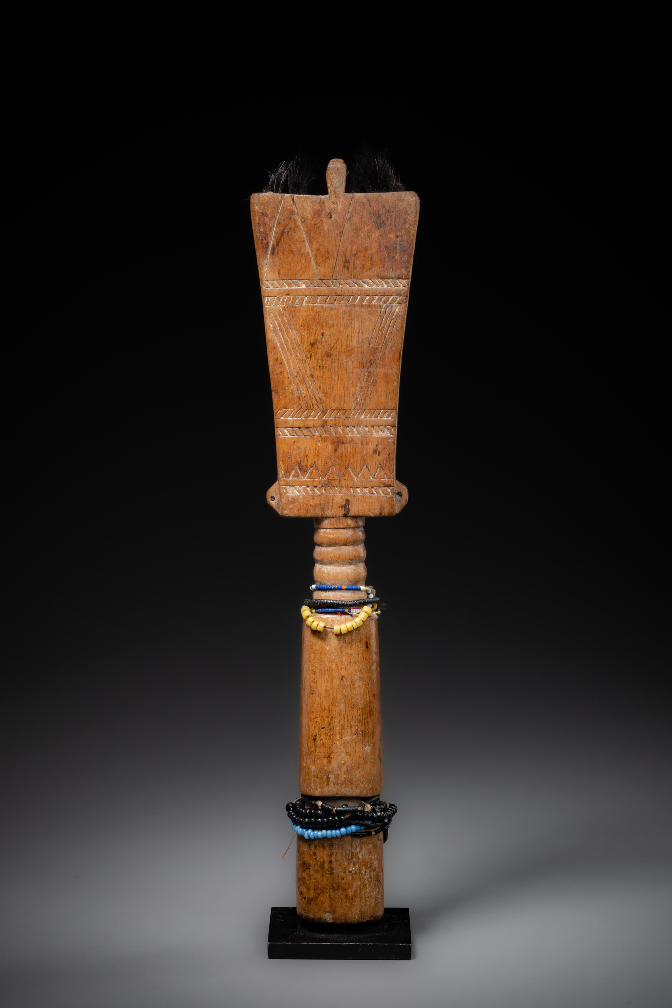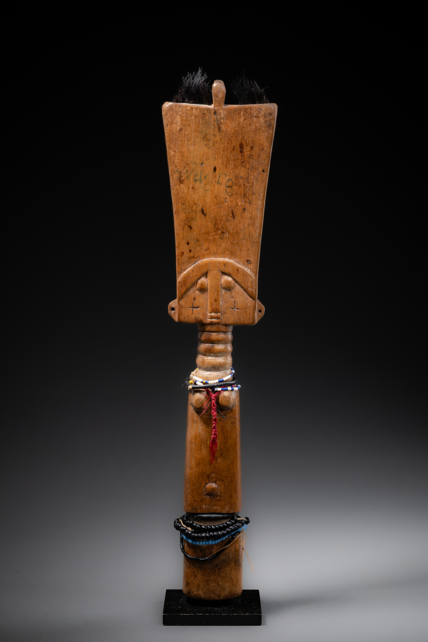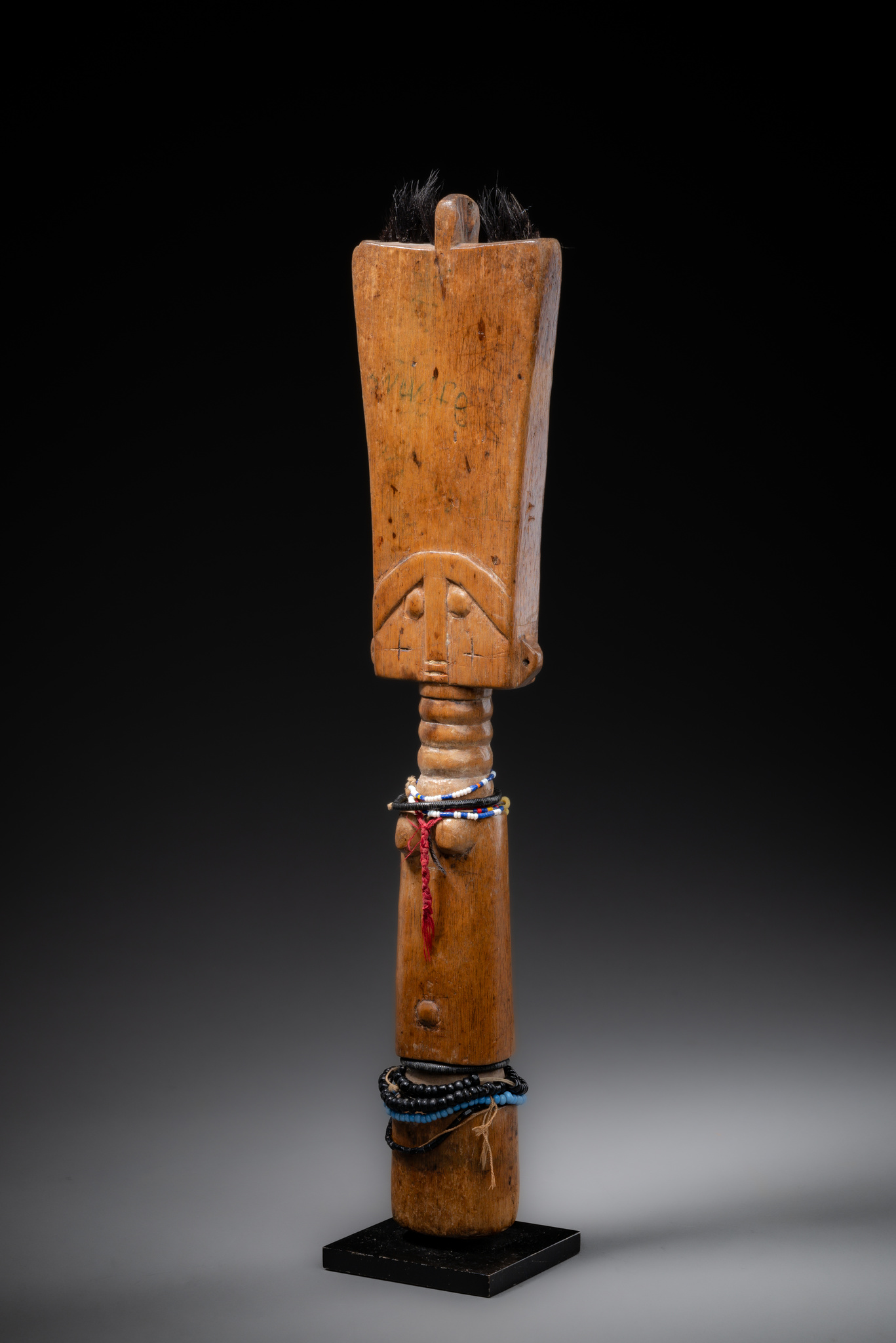 wood, pokerwork, hair, fiber, glass beads, base