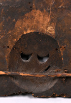 The largest, at the bottom, bears a masked face with openwork eyes in the centre. The back of the board is concave - probably intended to give the dancer’s head space and visibility. Wooden sticks attached to the back are the remains of a framework that was originally used for attachment.