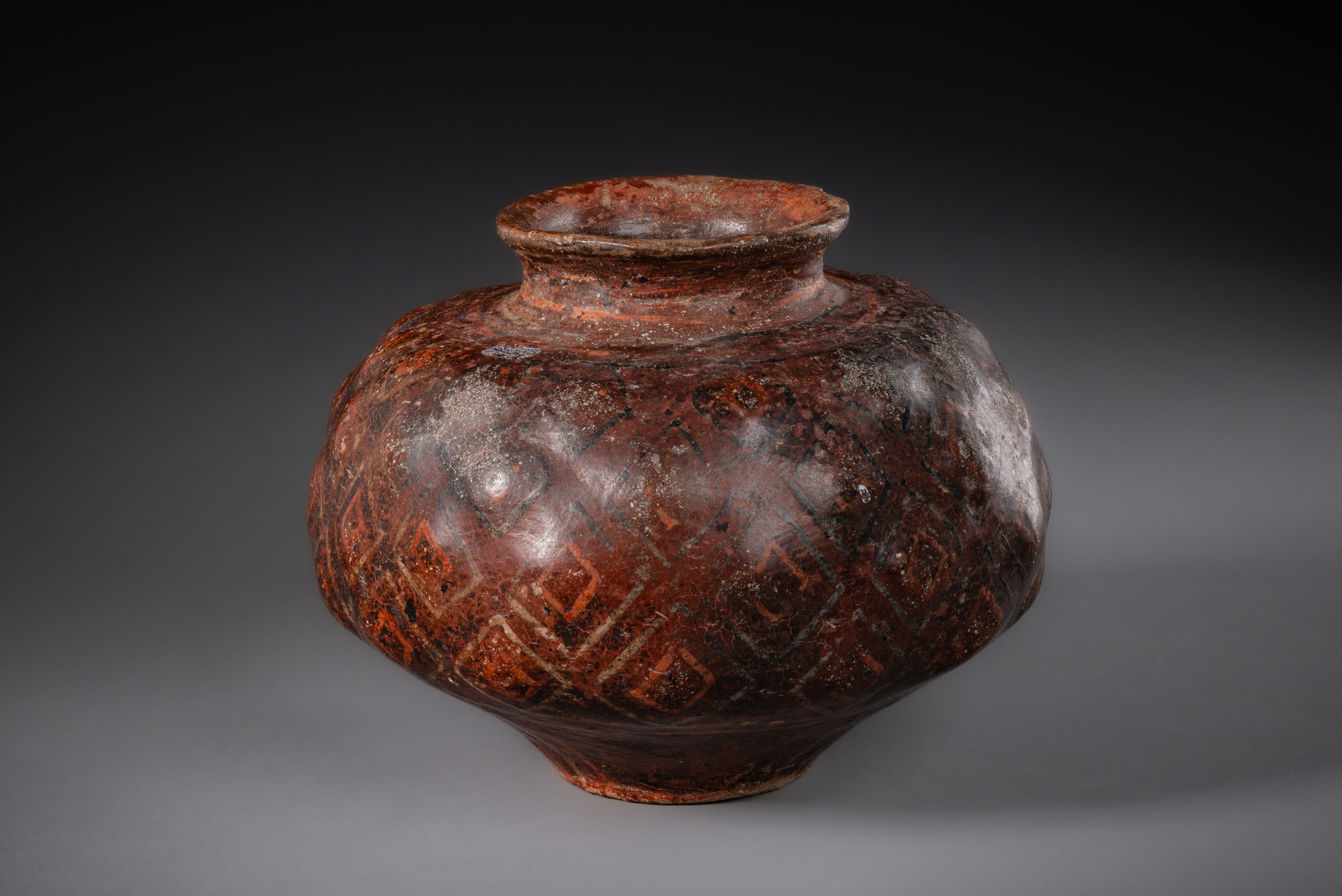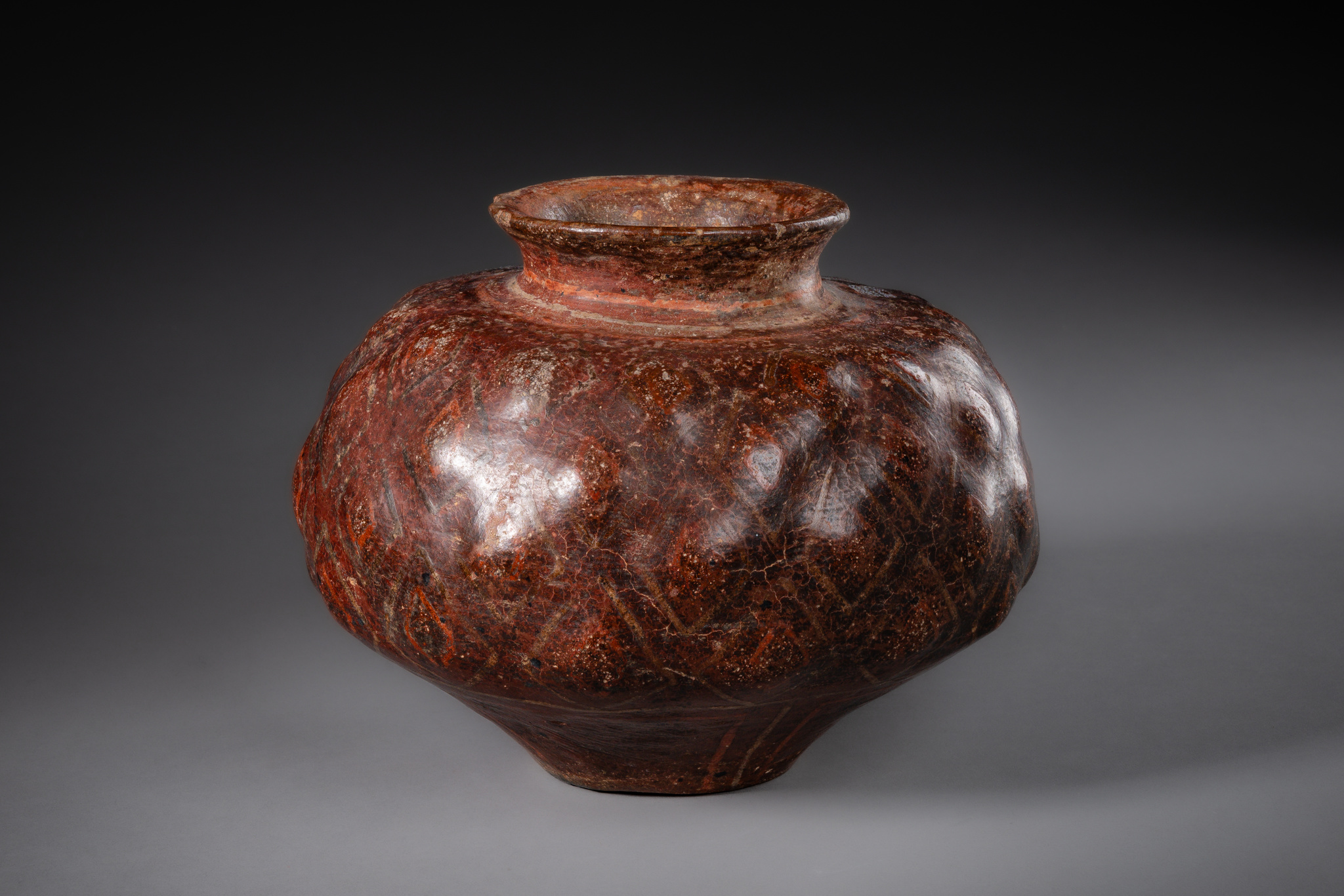 ceramic, painted in black and white on a reddish-brown background,