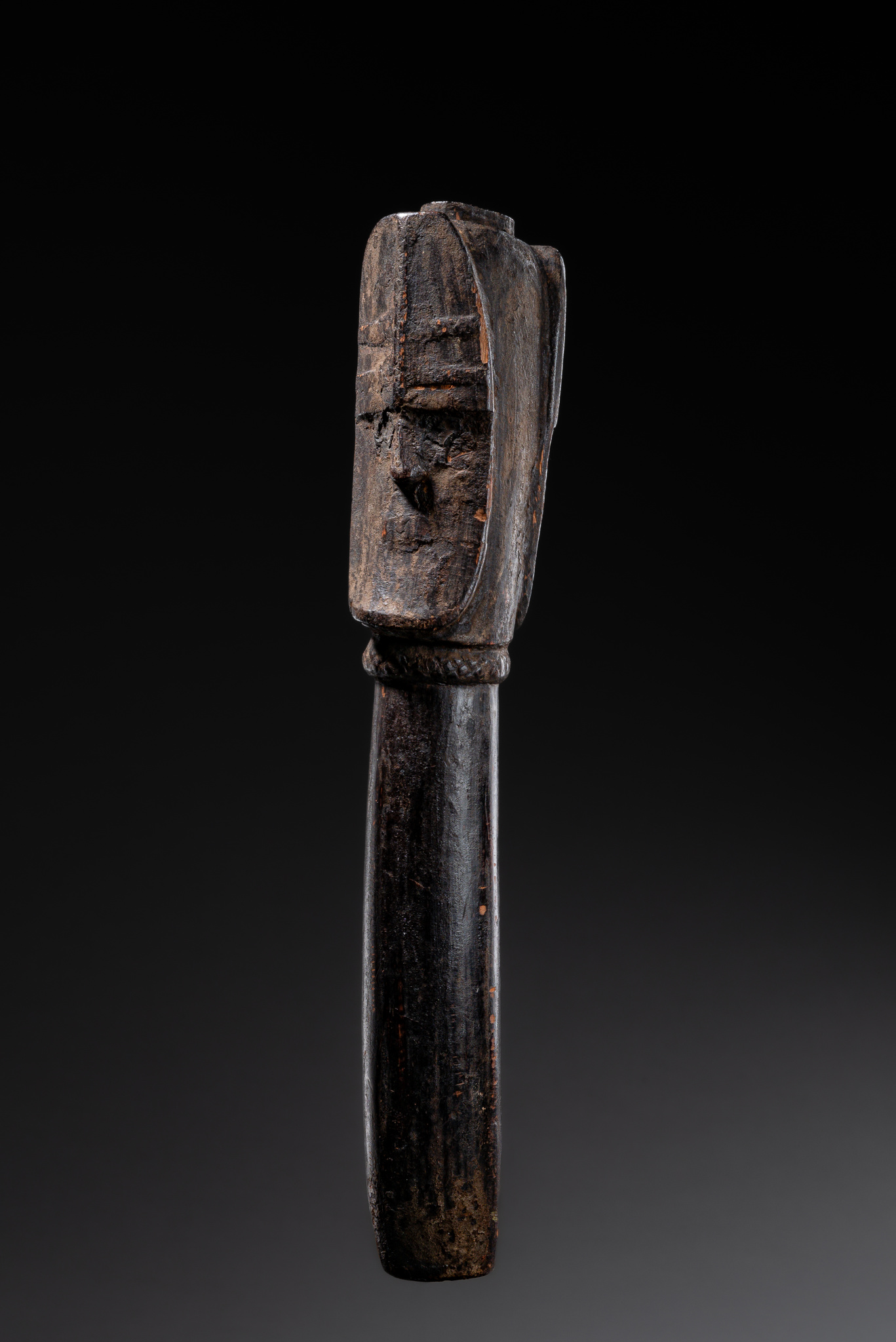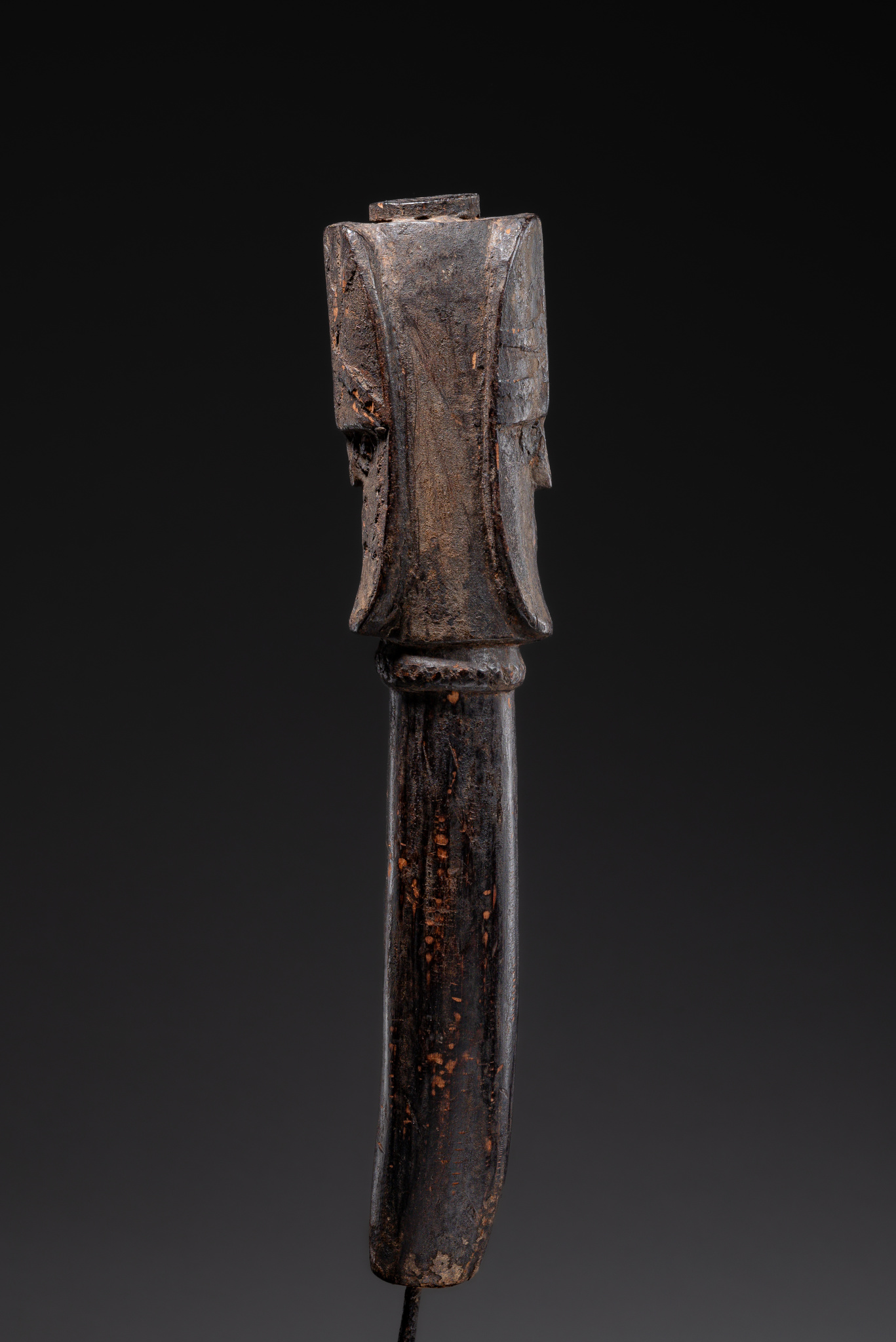 This is a reliquary finial with two faces from the cultural context of the Kota-Sango. Such figures served as protective and mediating elements atop containers that held ancestral remains.