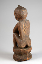wood, greyish brown patina, encrusted in some areas, sacrificial traces, typical squatting posture, rising from waisted wooden block, small hole in the parting, flattened back, slightly dam., minor missing parts (right ear, nose), traces of insect caused damage backside, cracks, abrasion of paint