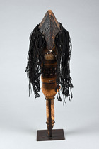 These head sculptures are used in Kuyu ceremonies honoring the snake god. Different actors appear one after the other. Among them are the “eouya” (the “snake people”) and the primordial couple (“djokou”, the father and “ebotita”, the mother). At the end of the performance, the chief initatior reveals “ebongo”, “the great serpent” and father of the “eouya”.