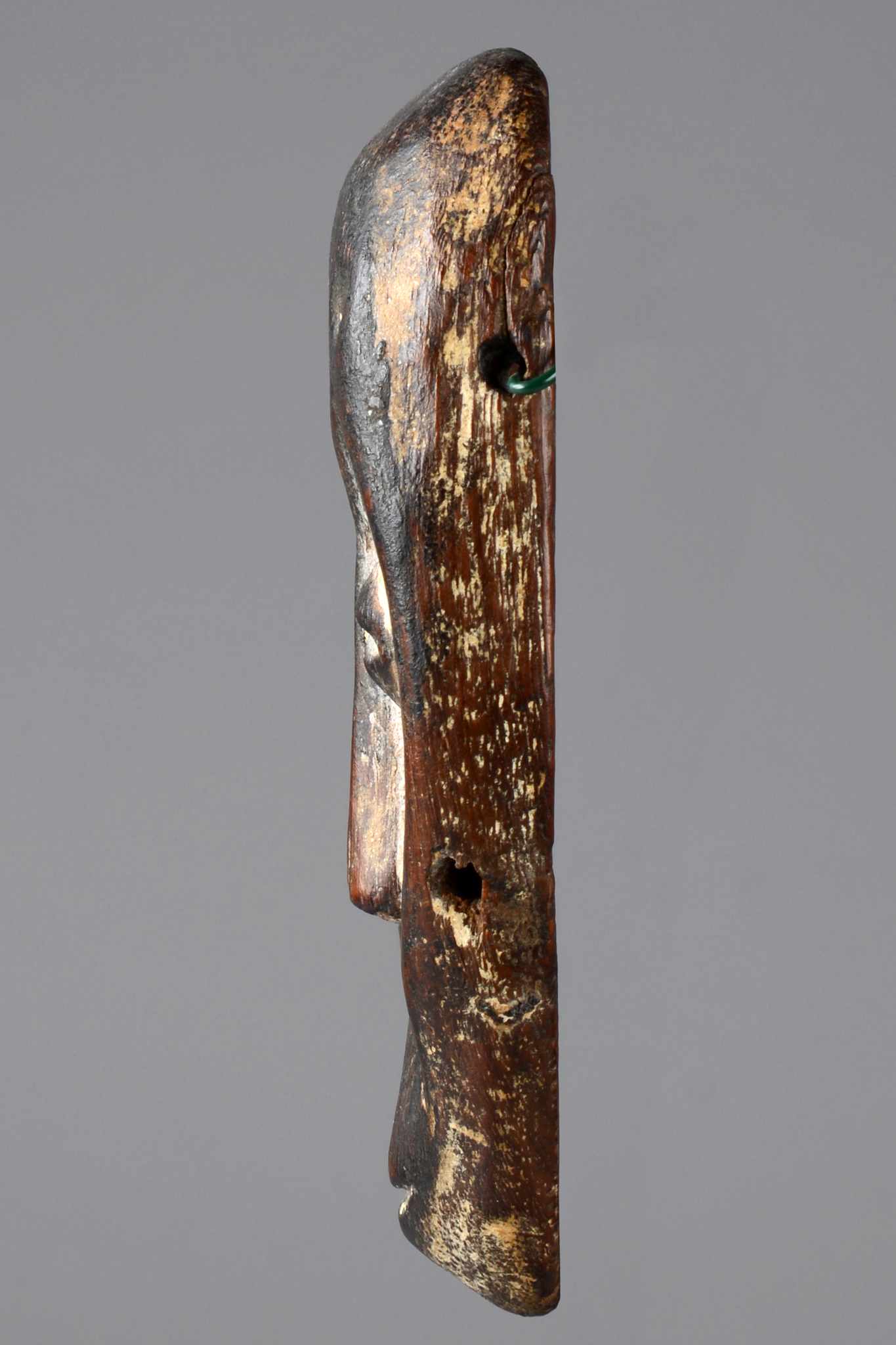 wood, slightly encrusted brown patina, remains of kaolin, incised scarification marks in forehead and cheek area, min. dam., small missing parts, slight traces of abrasion