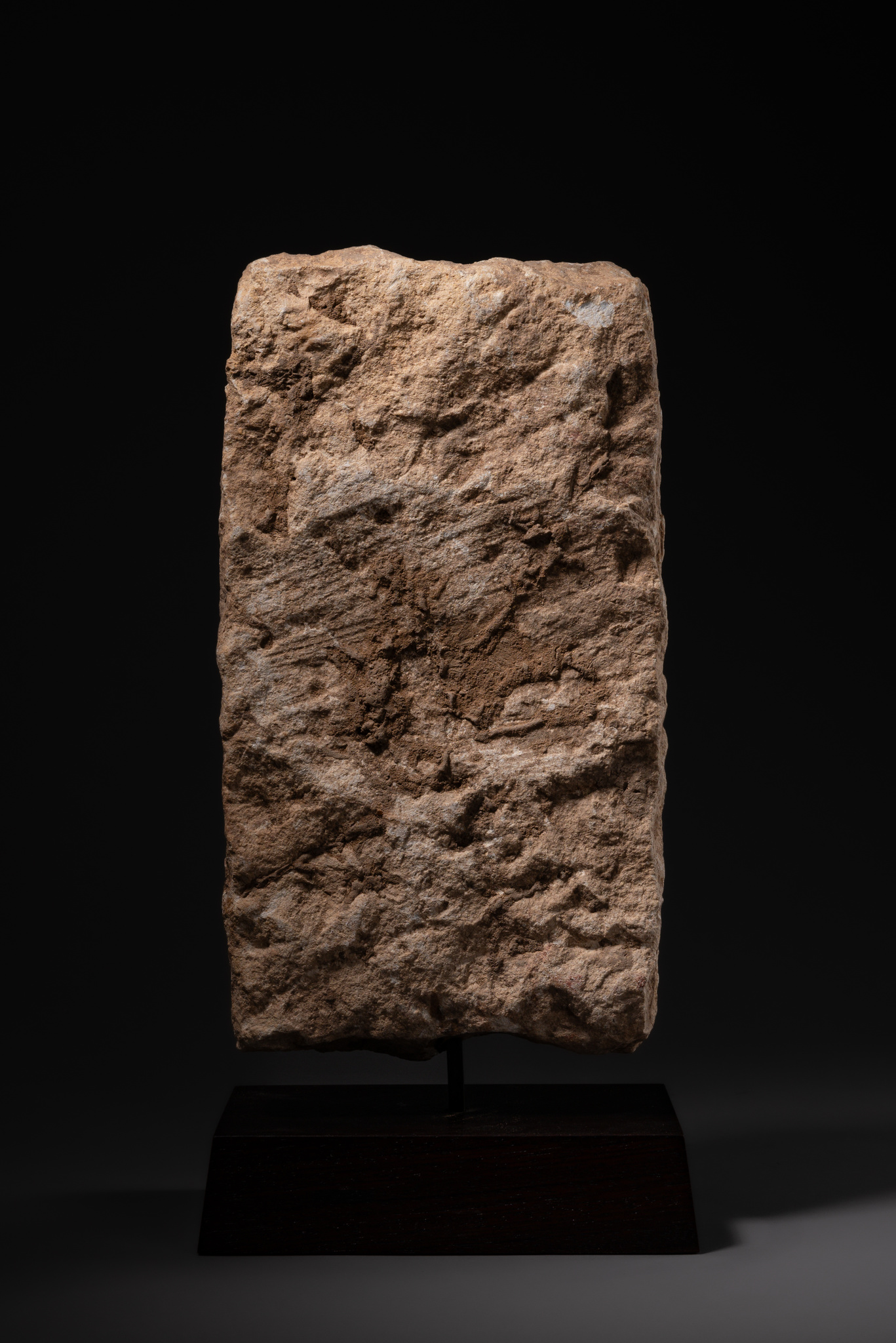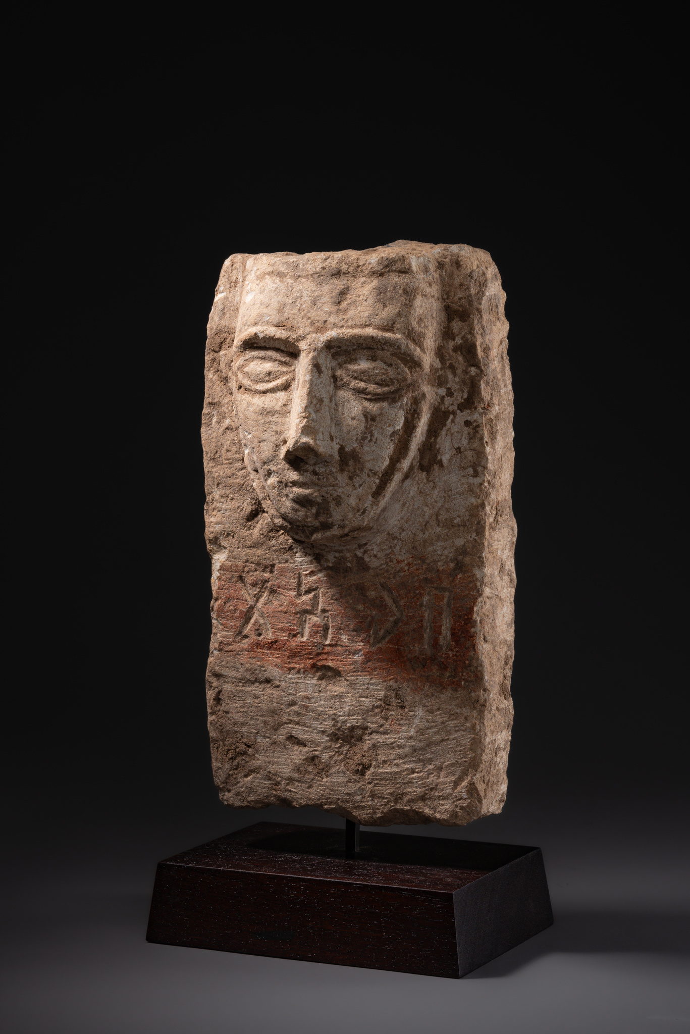 Rectangular limestone stela carved in high relief with a stylized human face. The almond-shaped eyes, prominent nose and small, slightly modelled mouth are characteristic of funerary monuments from the ancient kingdom of Qataban. Below the face, an incised panel bears four characters in the Qatabanic script, probably recording the name of the deceased. Traces of red pigment suggest that the surface was originally painted. Such stelae were placed in tomb façades or niches and served as memorials evoking the continued presence of the dead.