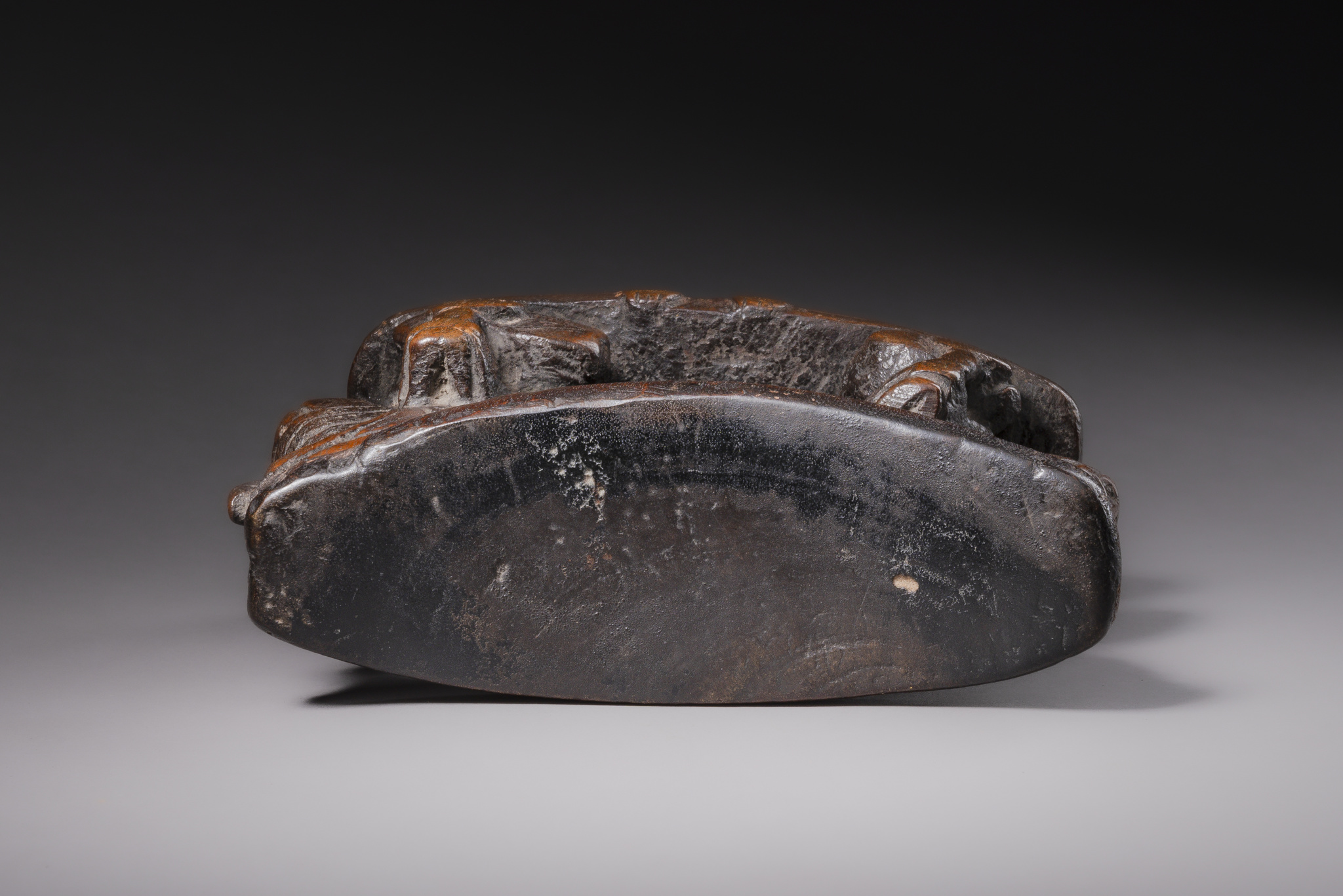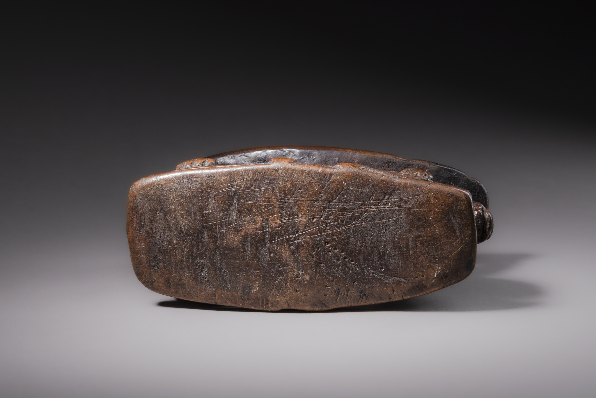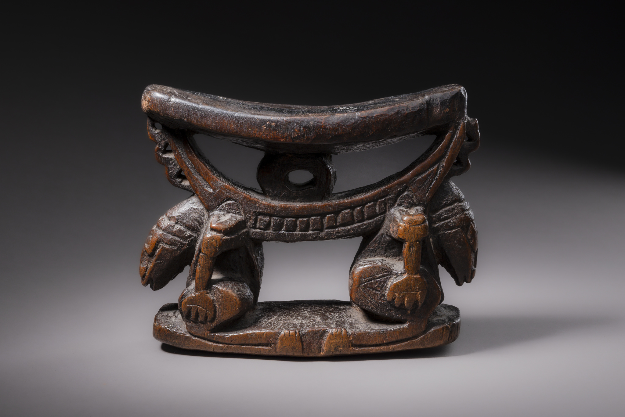 A noteworthy detail is the legs and feet of the kneeling caryatid figures, which are integrated into the sides of the flat base plate. This feature is found specifically in early examples of Tami neckrests and, in the present piece, can be seen as an indication that it was created before or at least at the beginning of European contact.