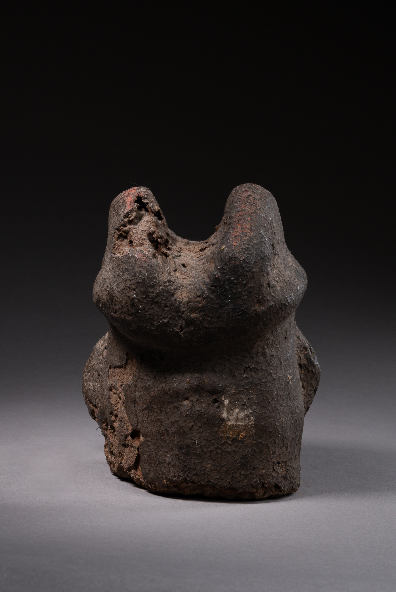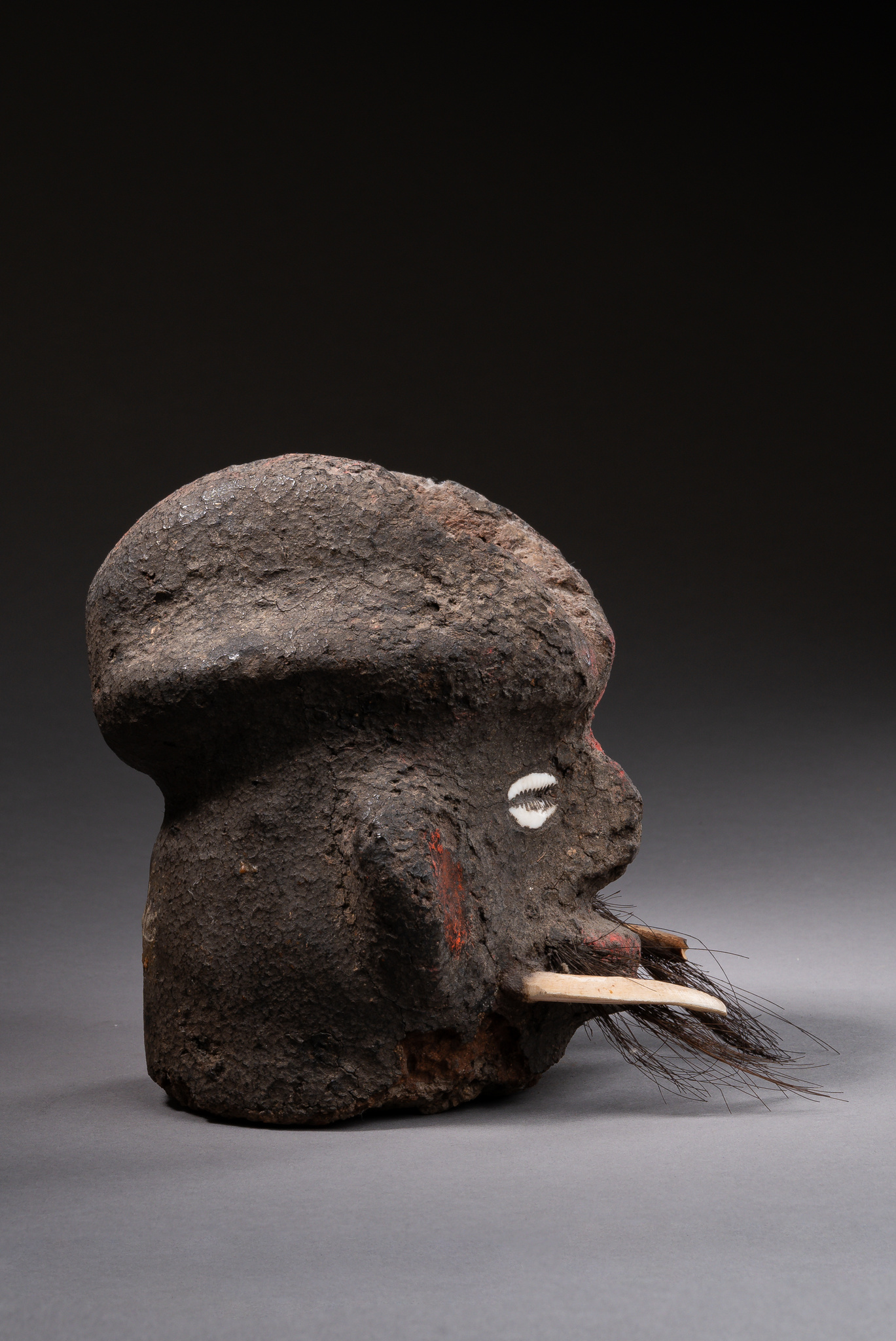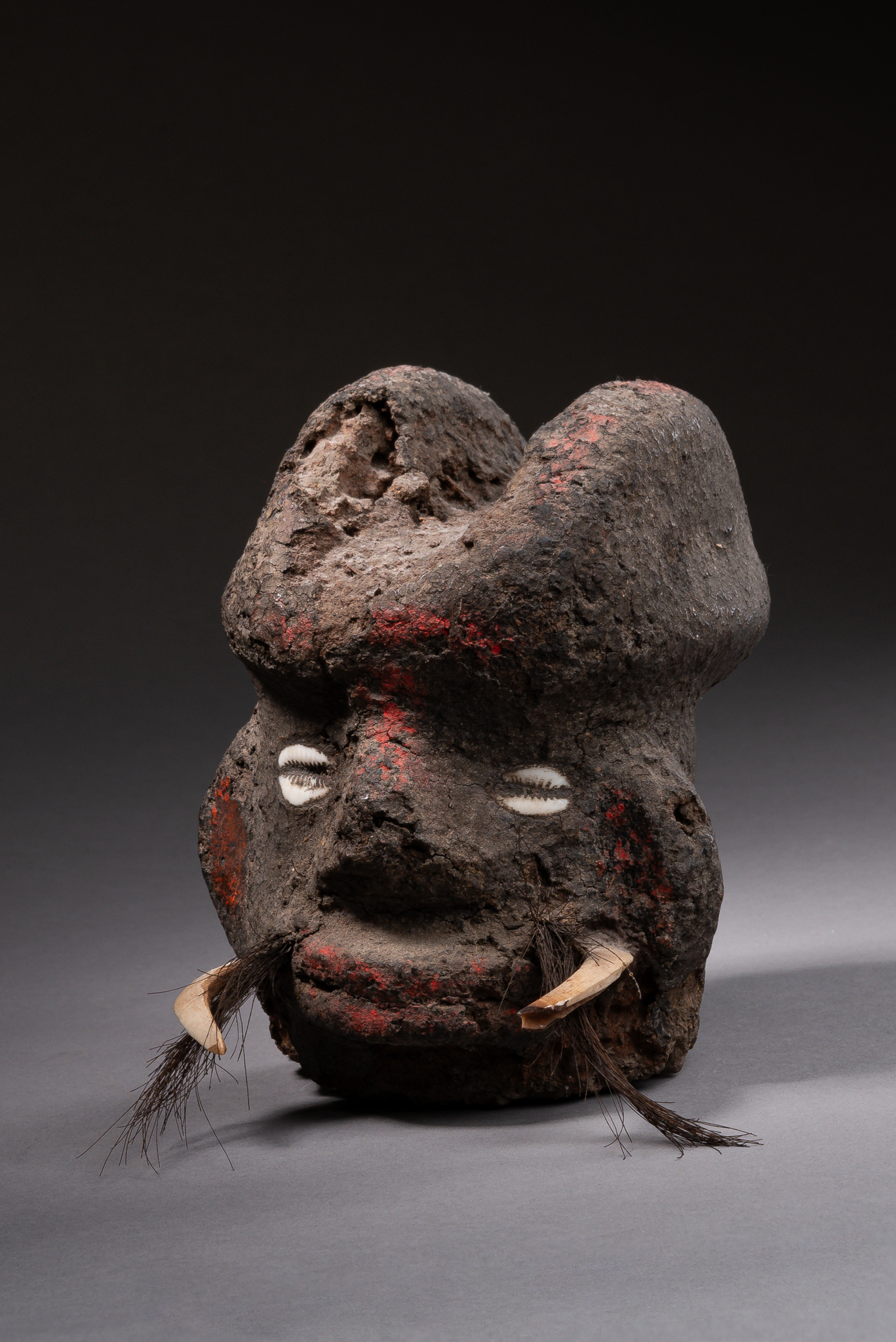 terracotta, cowrie snails, animal hair, wild boar tusk, red pigment,