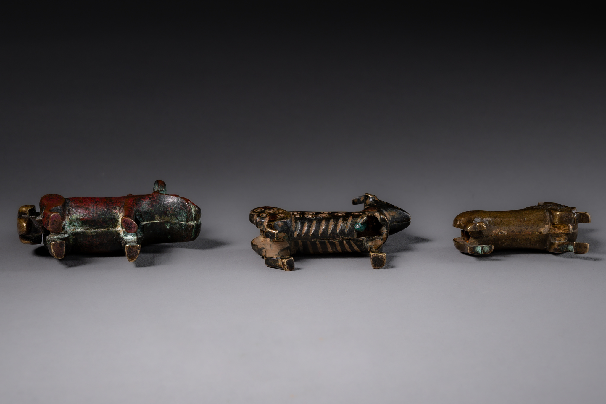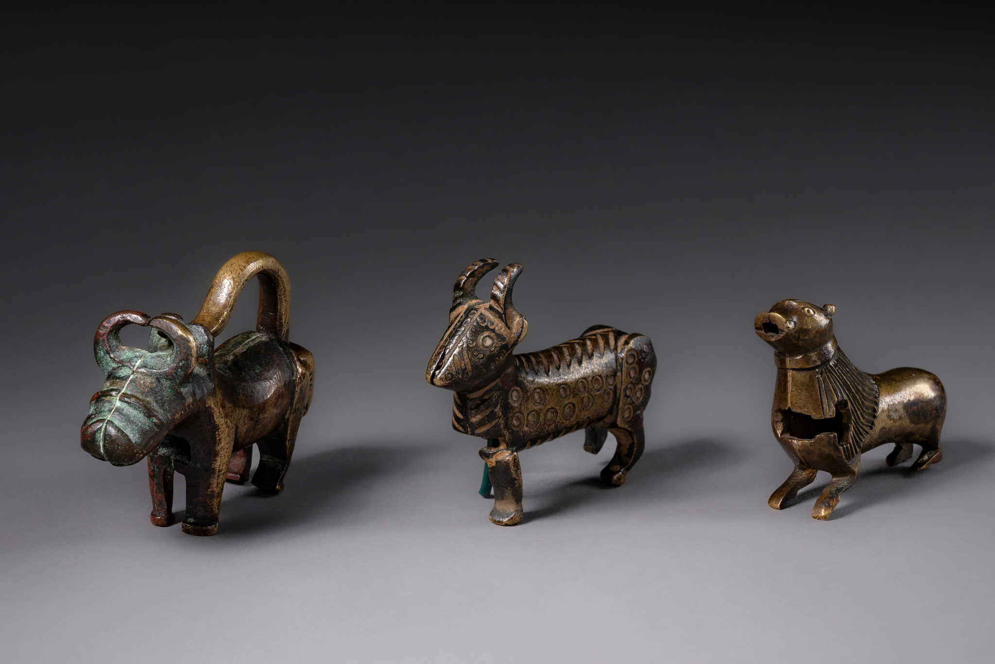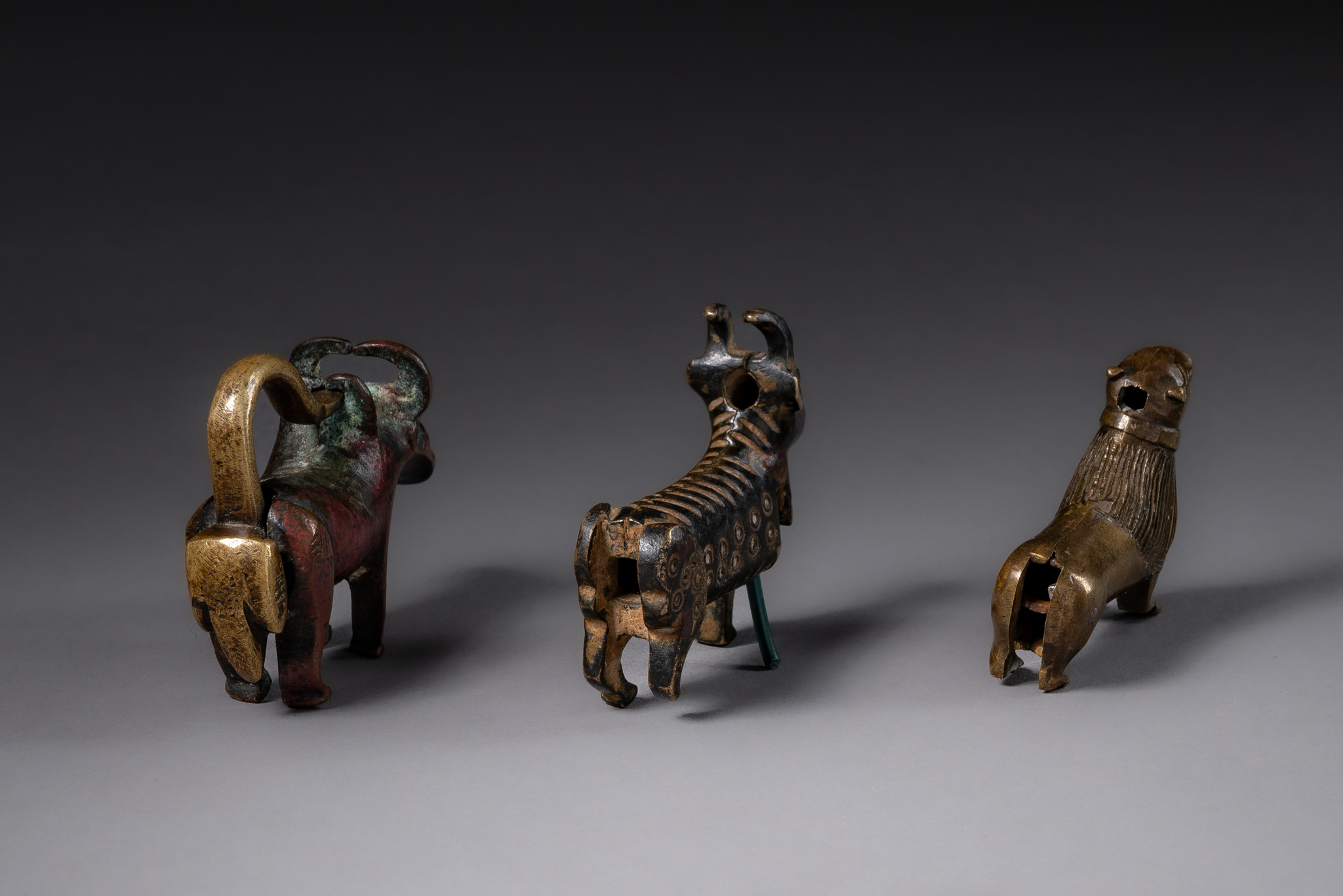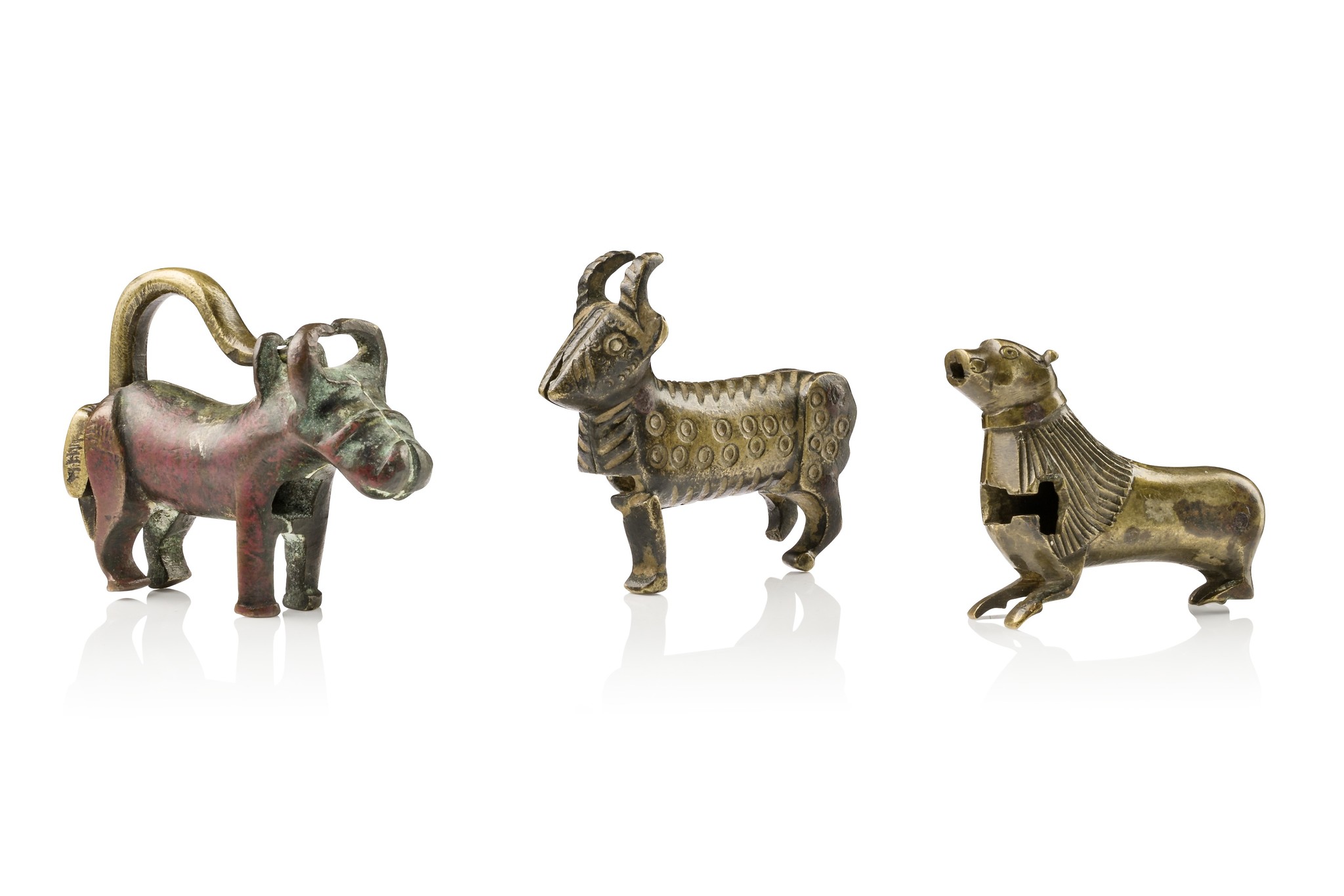 bronze, in the form of animals: lion, goat, buffalo (the latter with a full shackle lock)