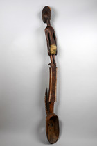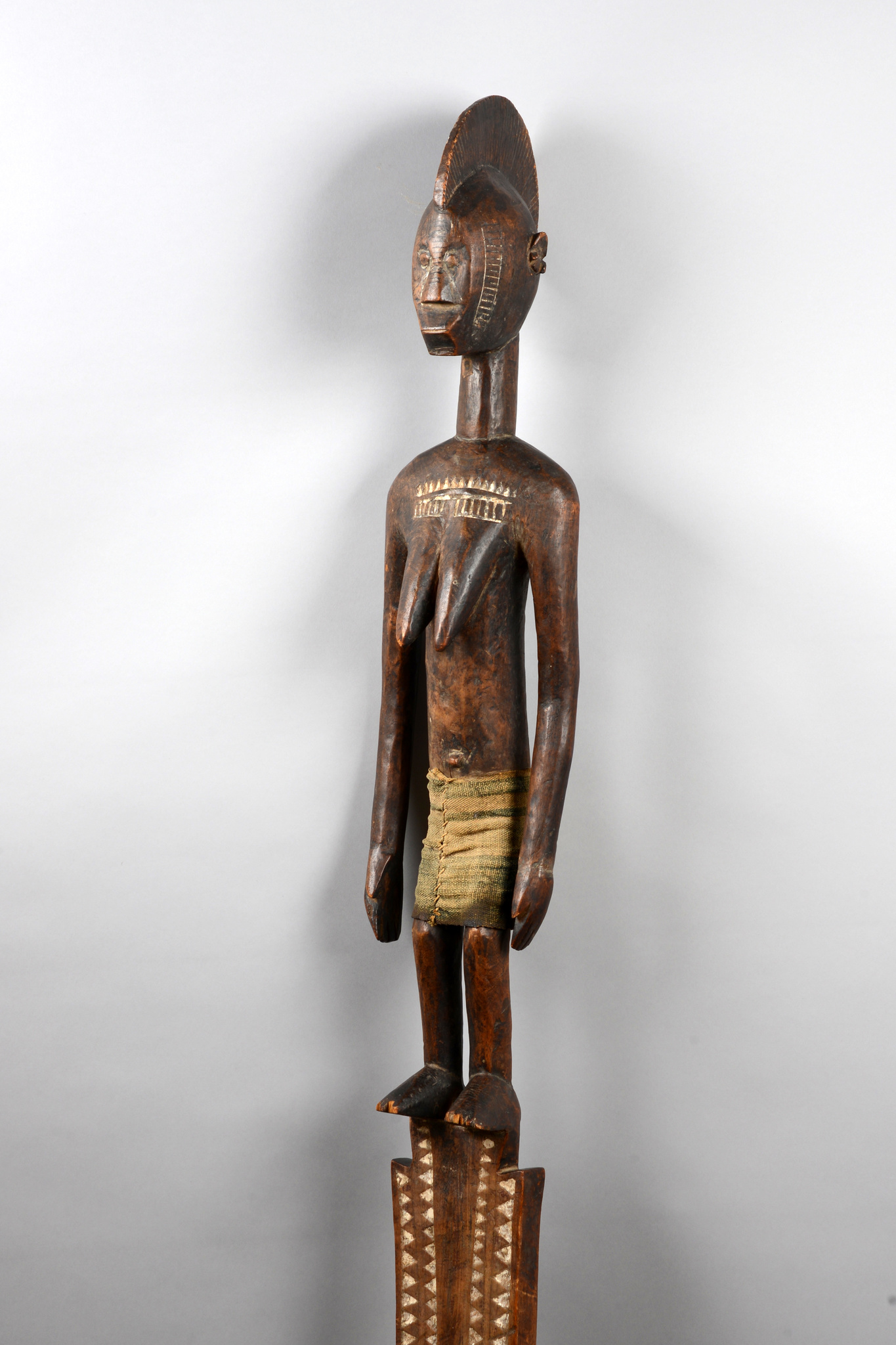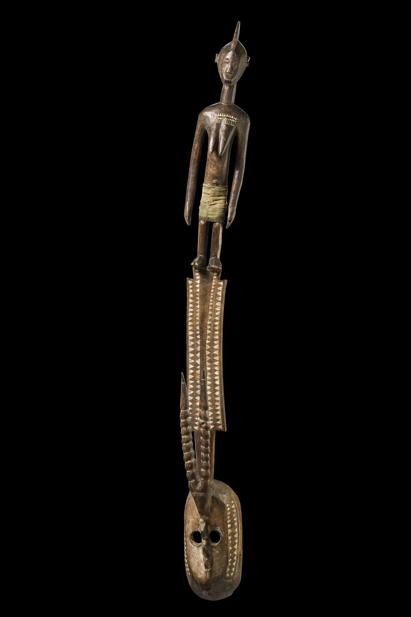 both the Mossi in Yatenga and the Dogon in Burkina Faso and Mali carve masks like this one with the figure of a woman above the face of the mask. This is because they share common ancestors. Dogon masks represent “yasigine” or “satimbe”, an elder woman who has experienced two “sigui” ceremonies sixty years apart and who is the only female member of the mask society. For the Mossi these represent a woman who has married, had children and grandchildren, and, whose husband having died, has returned to the home where she grew up. There she is regarded as a living ancestress, and when she dies her funeral is celebrated with a mask like this example.